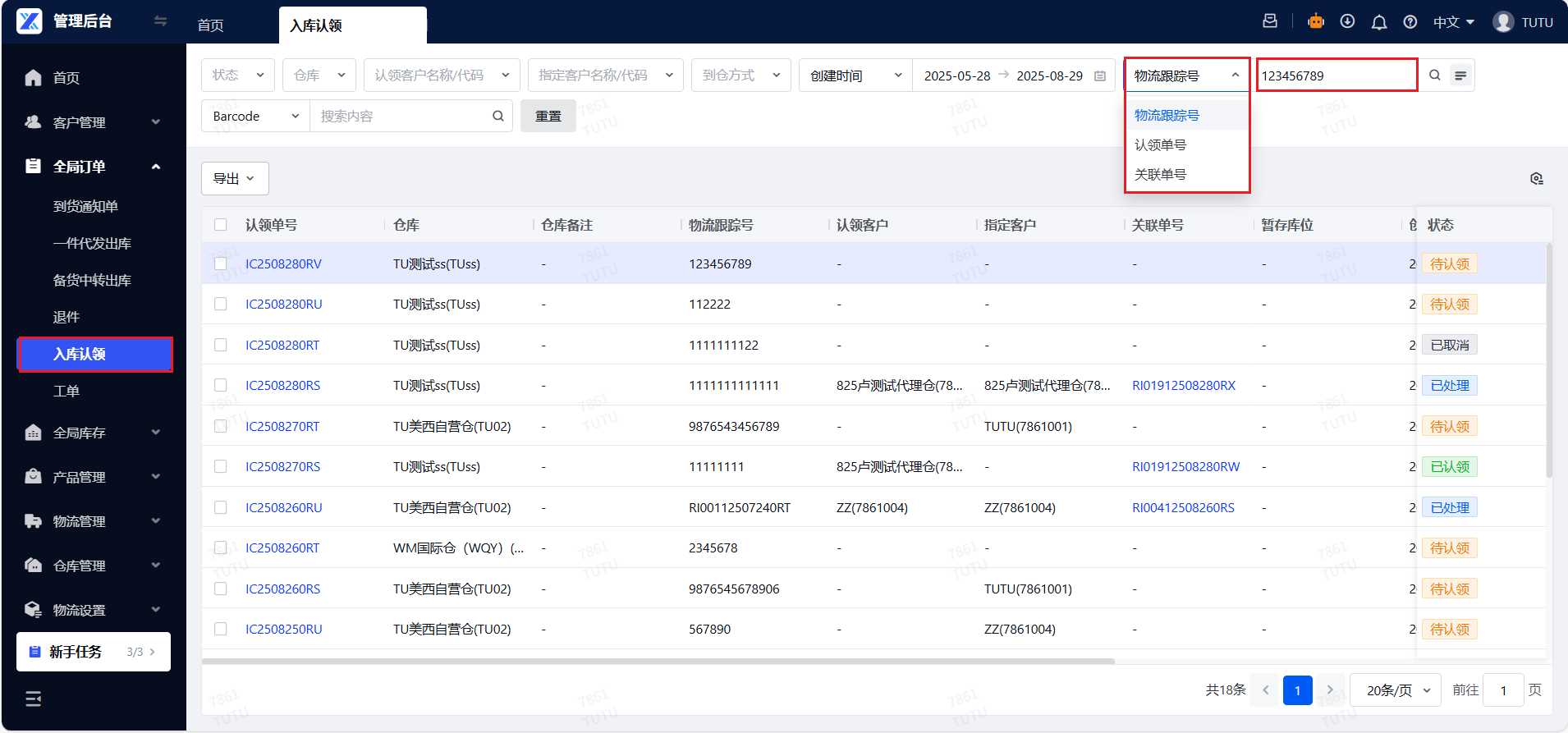 (4)查阅入库认领单:导航至入库认领菜单,点击物流跟踪号可以选择搜索字段,输入对应字段后点击搜索,即可定位入库认领单。