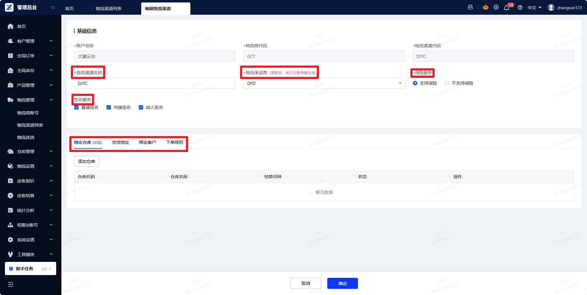(3)编辑物流渠道:在对应物流渠道右方点击编辑,可编辑物流渠道名称、承运商、是否支持保险和签名服务以及绑定仓库和客户、填写发货地址、创建下单规则。