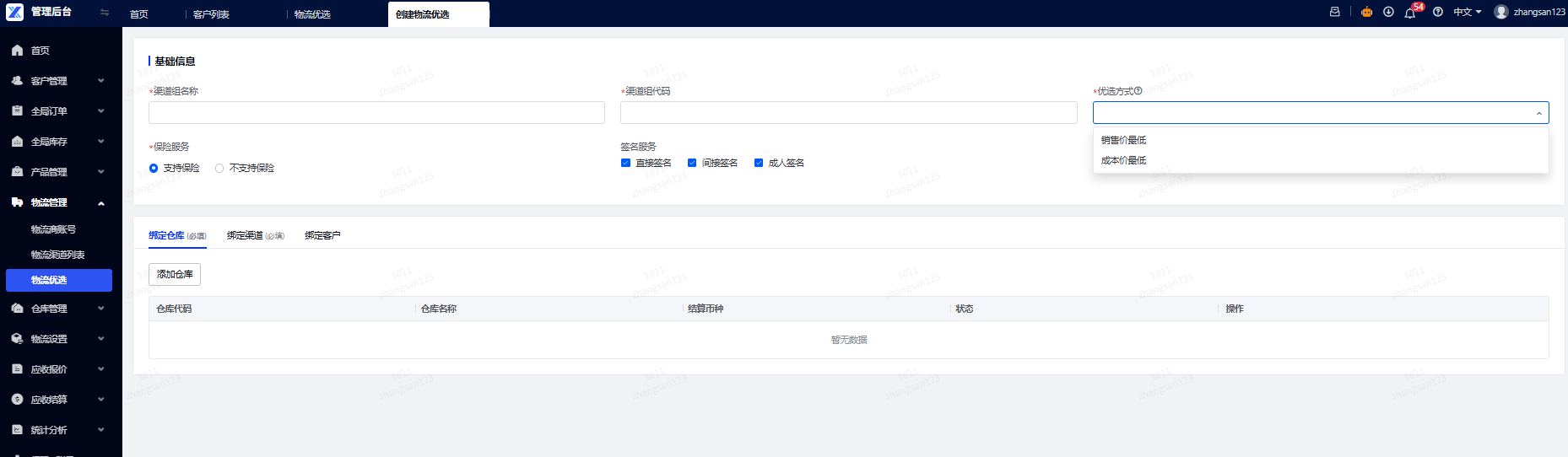 (1)设置位置:在OMP-物流管理-物流优选-创建