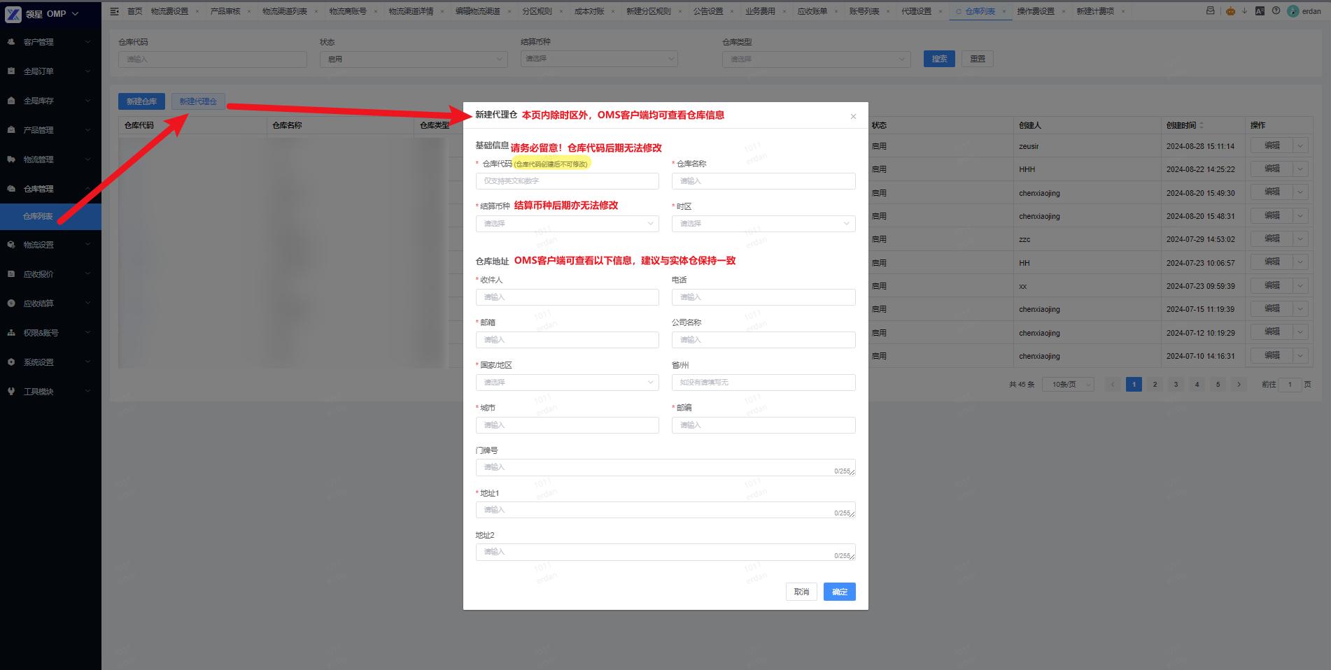 除时区外,当前界面的全部信息在领星OMS客户端均能查看,建议仓库地址填写与实体仓一致。
