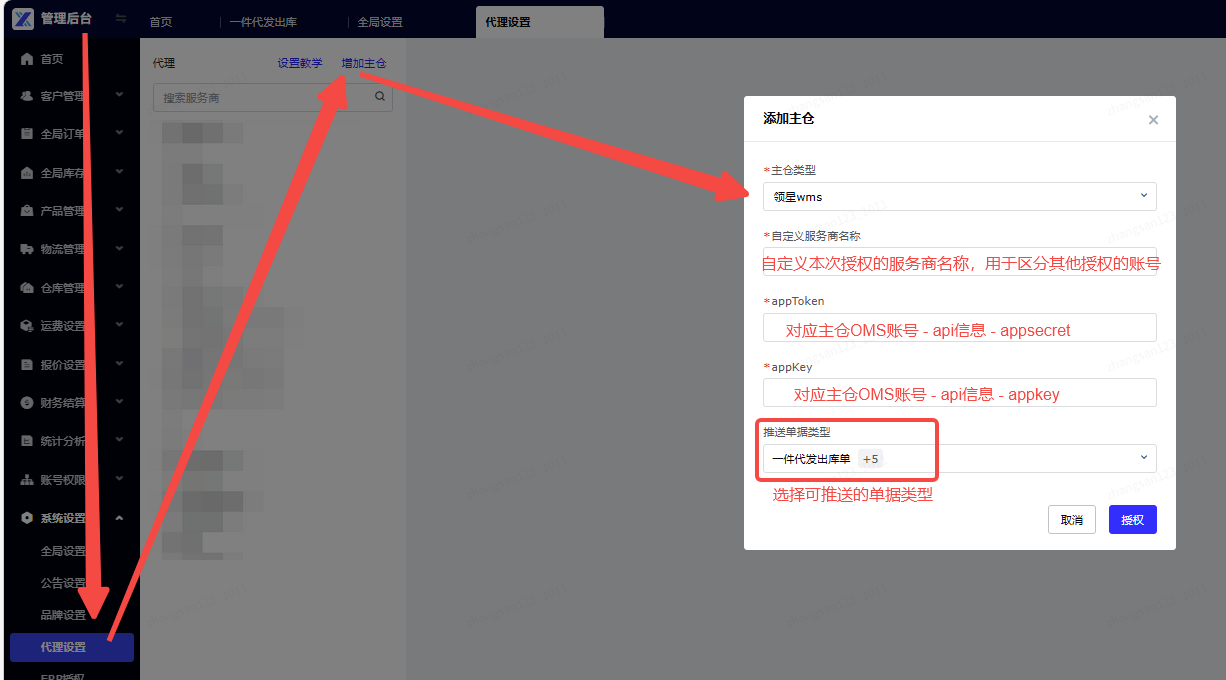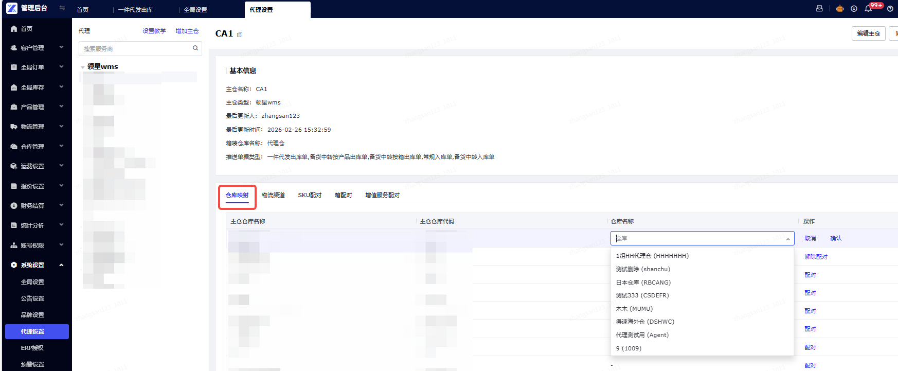 【路径】:管理后台 - 系统设置 - 代理设置 - 增加主仓 - 选择“领星WMS”