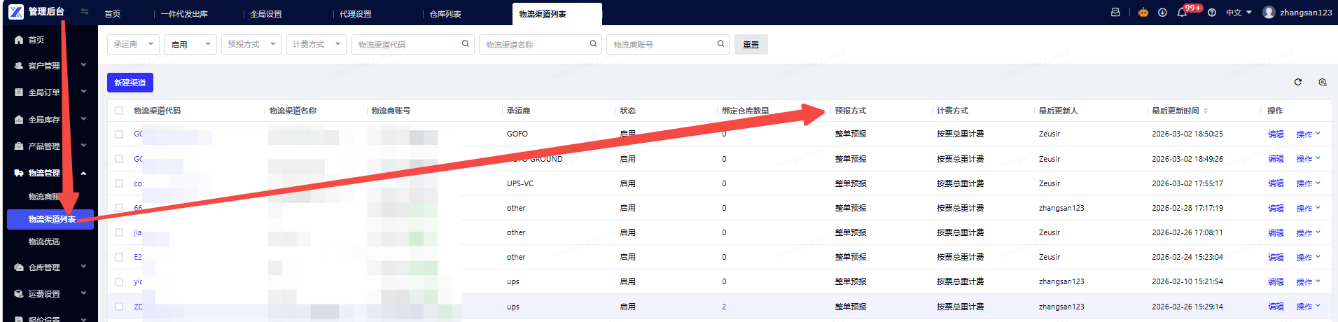点击编辑,选择对应的物流渠道,支持海外仓OMS的一个渠道绑定代理仓OMS的多个物流。