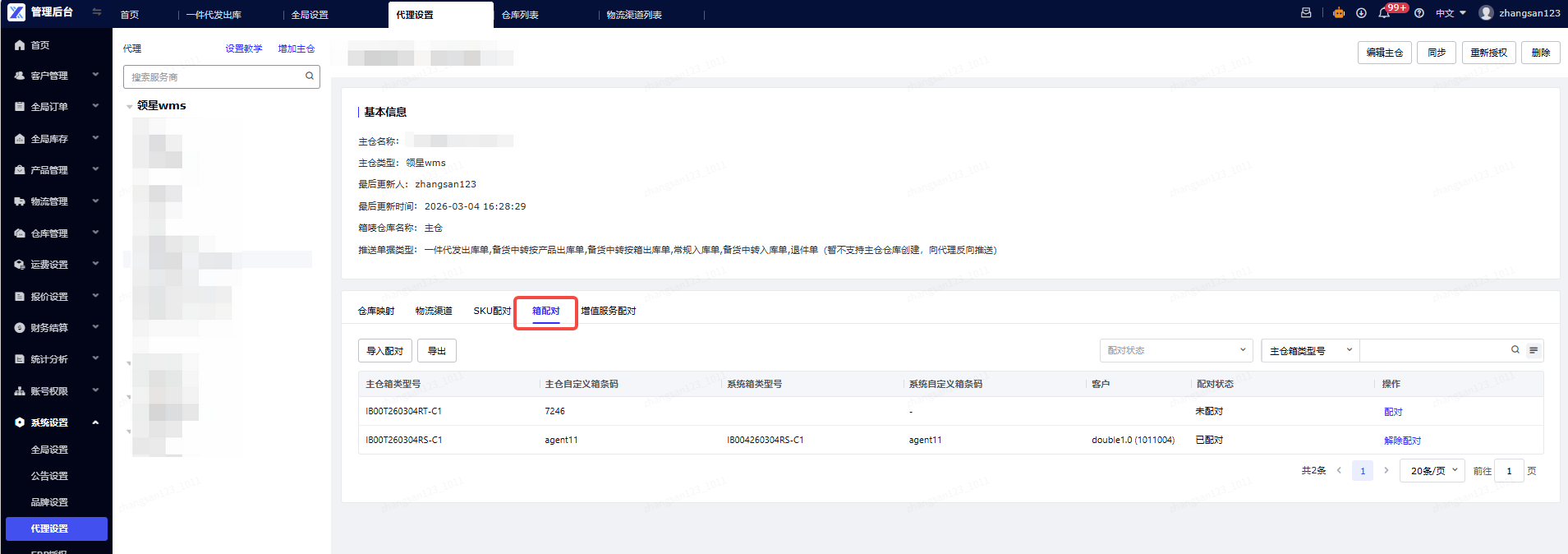 ①若箱库存是通过备货中转入库单自动推送到主仓收货上架生成的,拉取后默认为【已配对】状态,并展示代理中配对的箱子;支持手动变更配对关系。