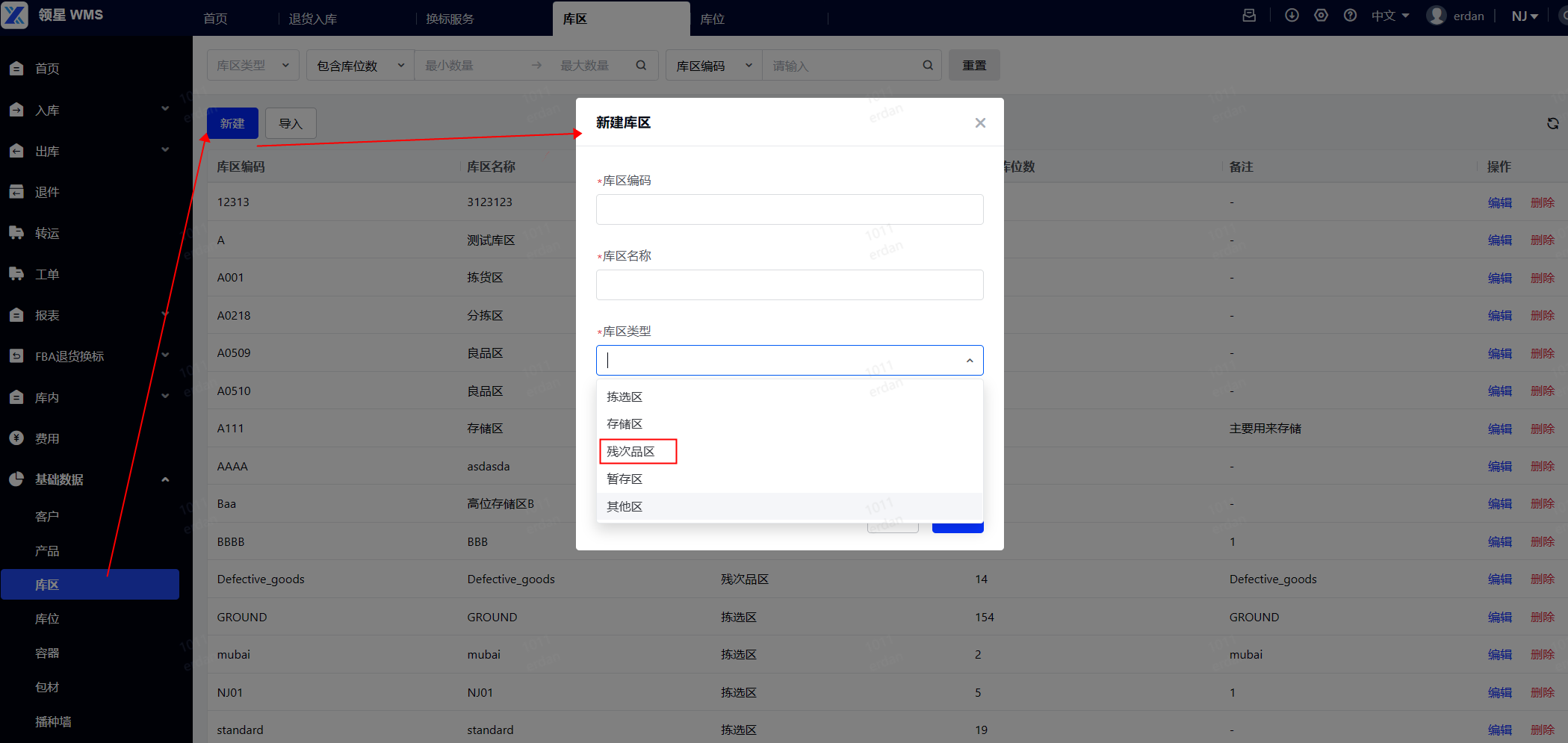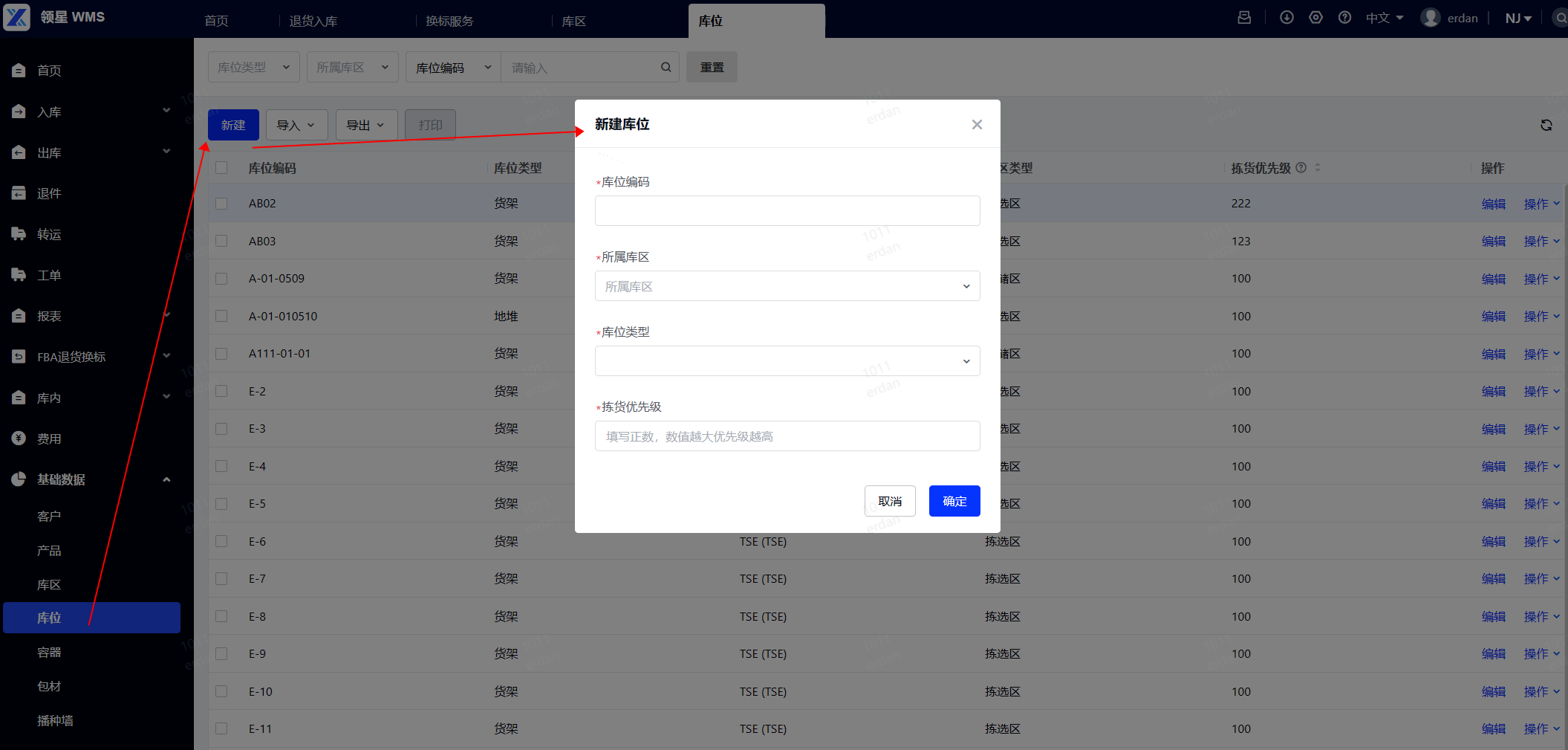 【路径】:领星WMS - 基础数据 - 库区 ----> 库位