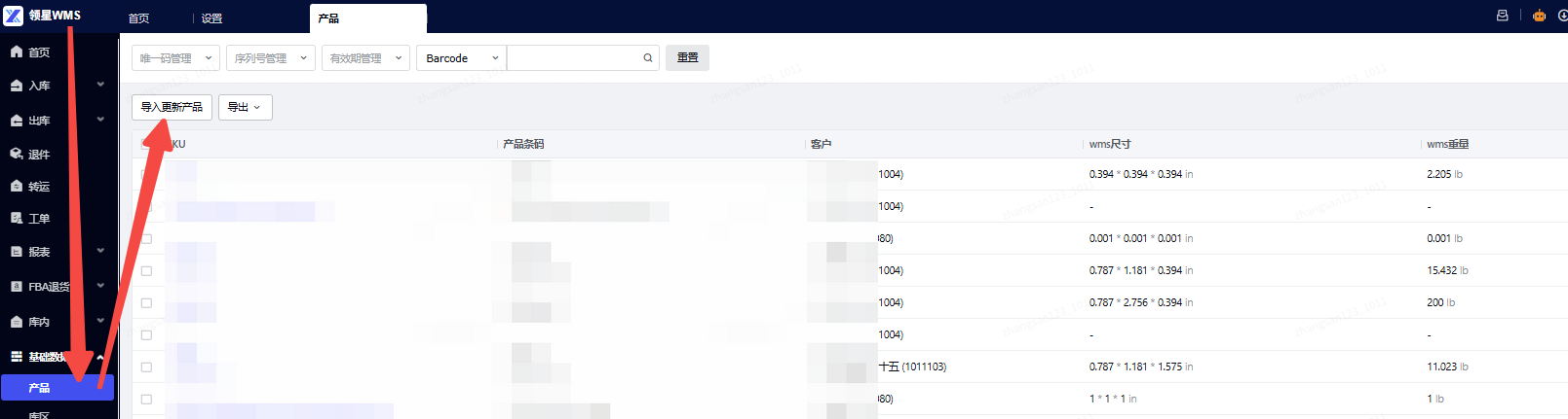 【注意事项】:上一步库存初始化导入的SKU,WMS尺寸及重量默认按创建SKU时的OMS尺寸重量填充。如果不正确,可以通过“导入更新产品”,调整为正确的WMS尺寸重量。如果上一步未操作库存初始化导入,可创建入库单,海外仓操作上架后,可同步海外仓测量的尺寸信息。