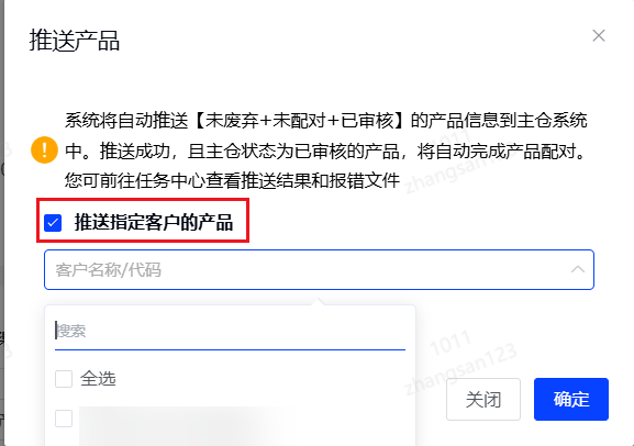 默认推送状态为“已审核+未配对+未废弃”的SKU至主仓,如需指定推送部分客户的SKU,请勾选“推送指定客户的产品”;
