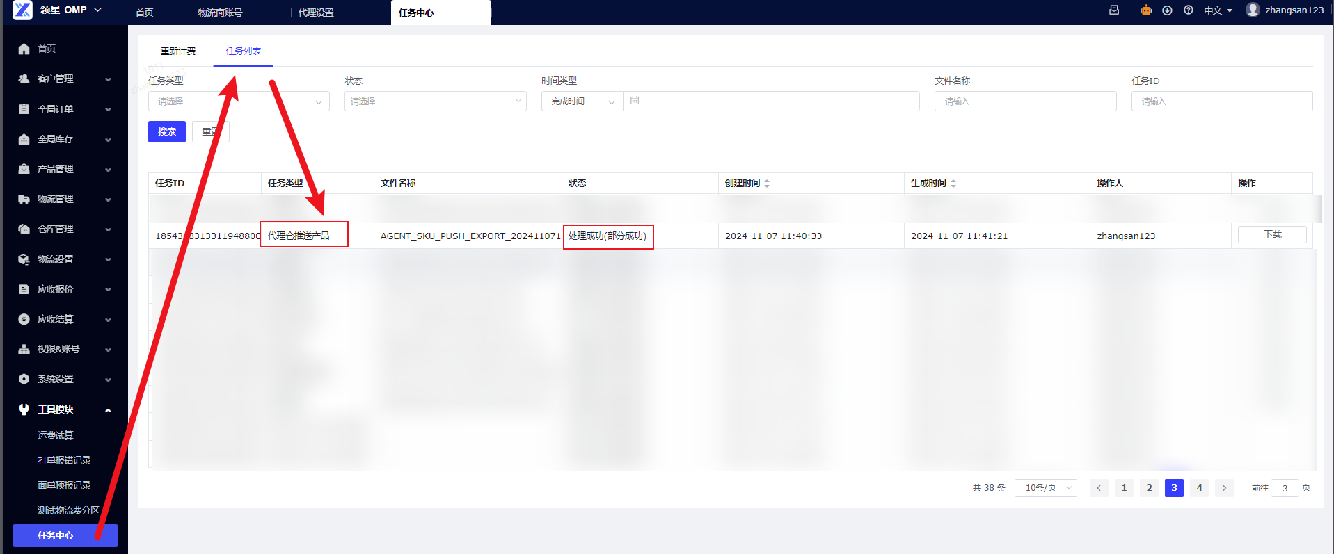 推送任务可在领星OMP - 任务中心 - 任务列表中查看完成进度。如果任务失败,可下载失败文件查看具体失败原因;