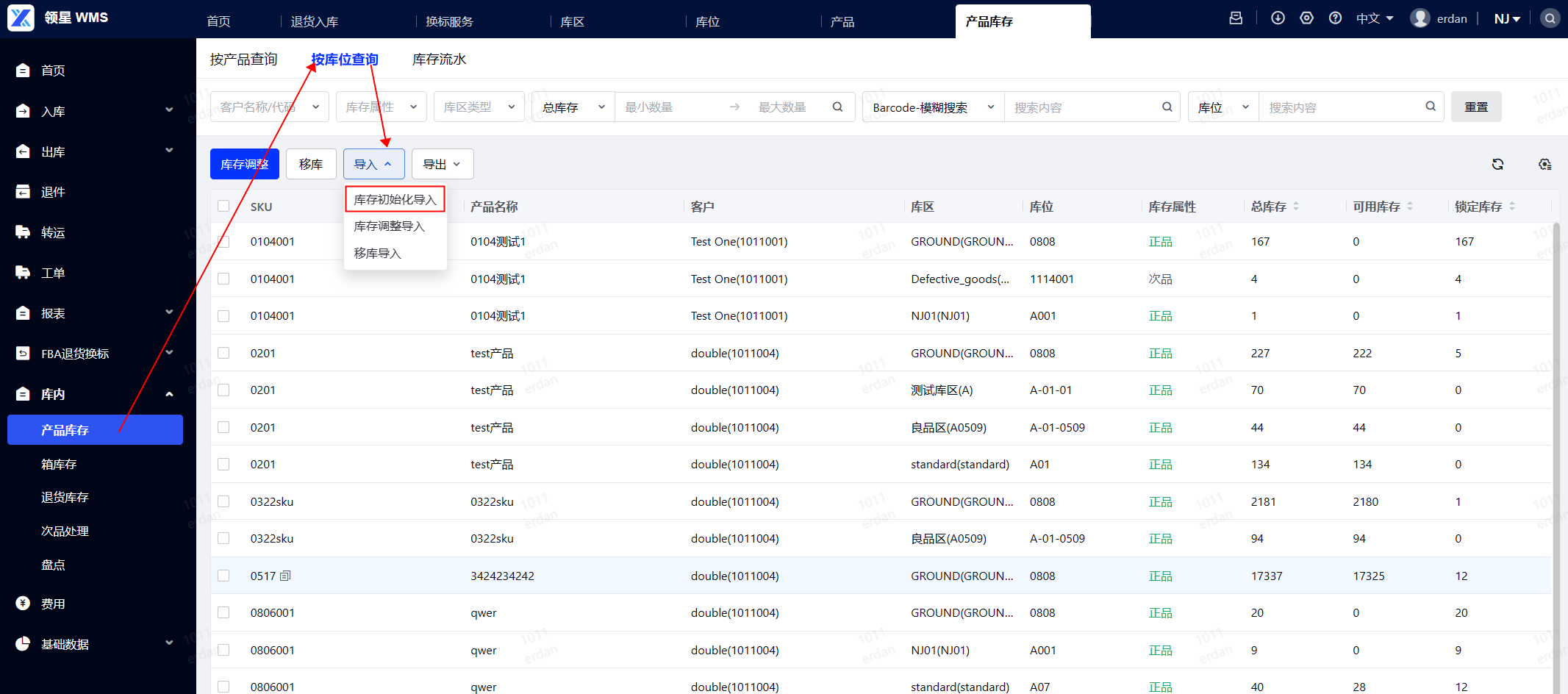 【路径】:领星WMS - 库内 > 产品库存/箱库存 > 按库位查询 > 导入 >库存初始化导入