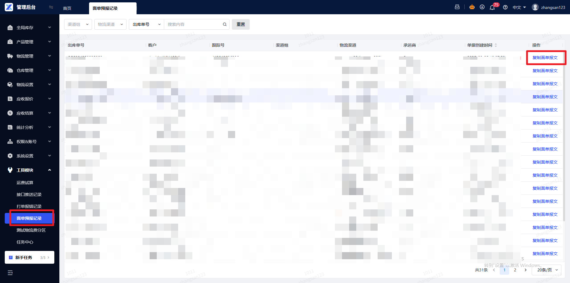 (2)复制面单报文:导航至面单预报记录菜单,点击复制面单报文按钮。