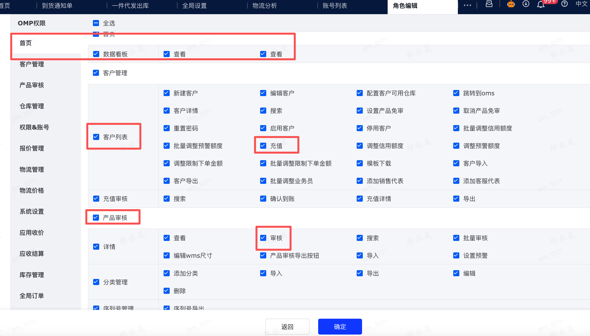 小程序【首页】和【OMP权限-首页】挂钩,【产品审核】和【OMP权限-产品审核-详情-审核】挂钩,【充值审核】和【客户管理-客户列表-充值】挂钩。