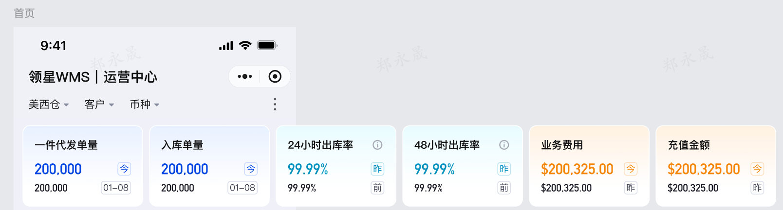 支持按仓库、客户下拉多选,币种仅支持单选,筛选后将关联首页看板的相关数据