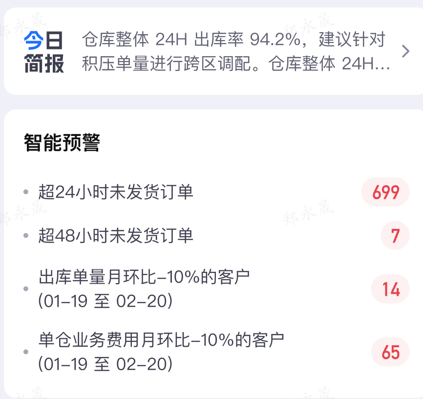系统会每日定时扫描系统数据,进行智能预警,如当前所有仓库中24/48小时未发货订单、近七天单量月环比下滑的客户量、近七天单仓业务费用月环比下滑的客户量