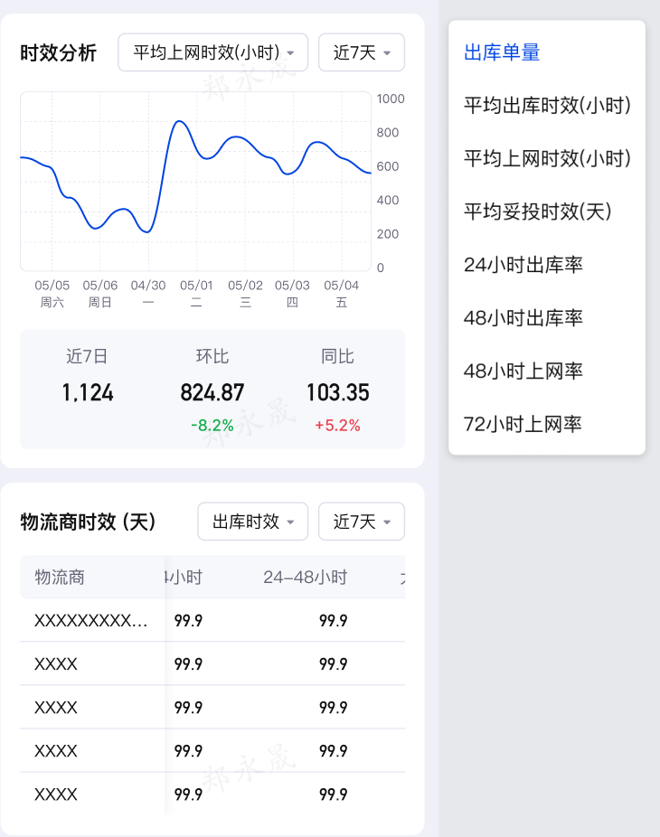 (4)时效分析,支持按指定指标查看仓库的时效情况,同时也支持按物流商查看出库/妥投时效。数据同管理后台-统计分析-物流分析。