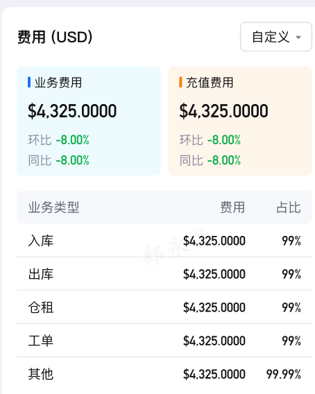 (5)费用,支持按自定义时间范围(取费用单据创建时间和充值时间)查看仓库的业务费用和充值费用情况,数据同管理后台-首页-费用看板