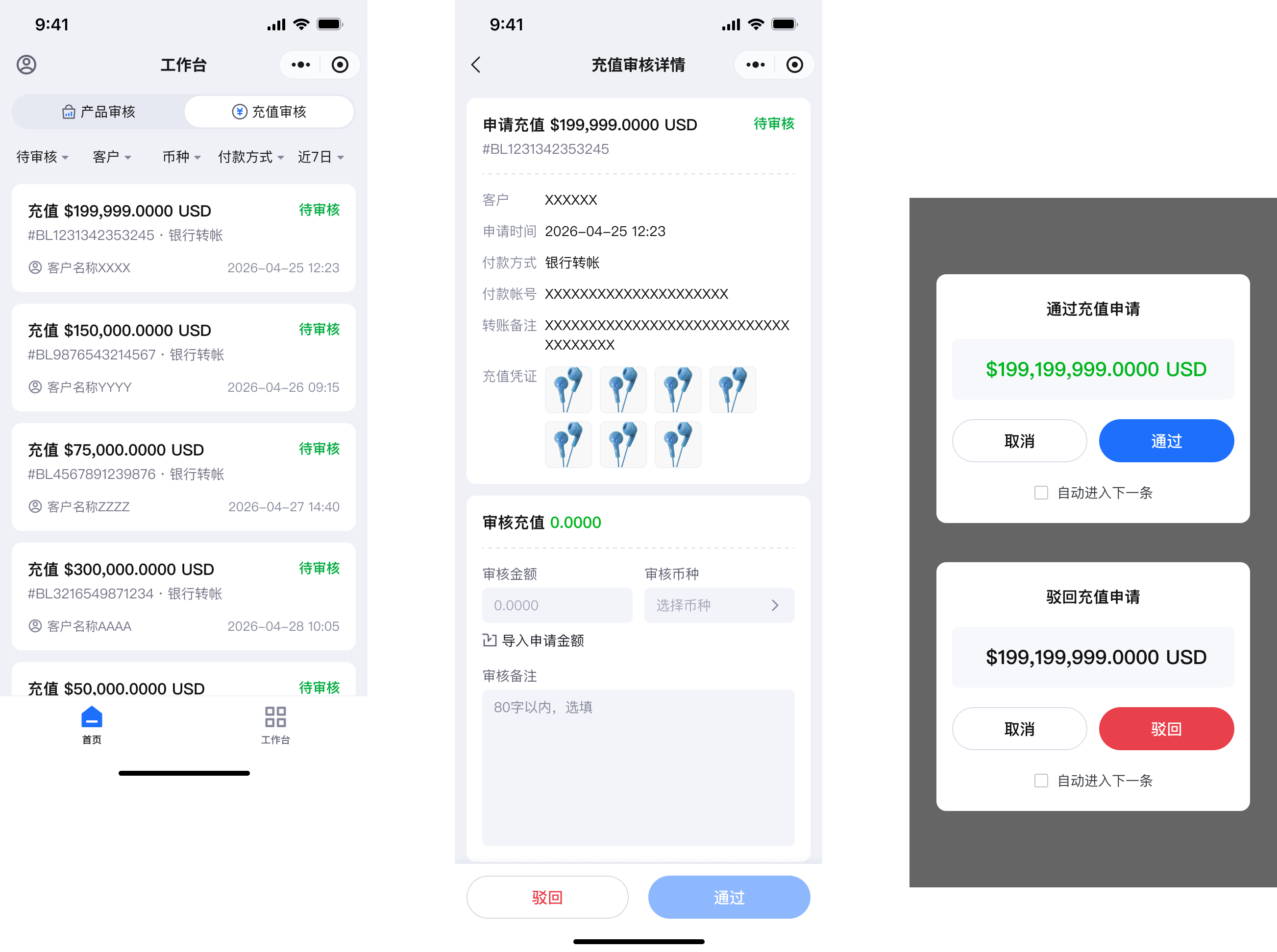 (7)工作台 - 充值审核。也需在列表中点击充值单的详情,并在详情页检查信息后并填如审核金额和币种后,点击驳回或通过,确认后即可完成充值审核