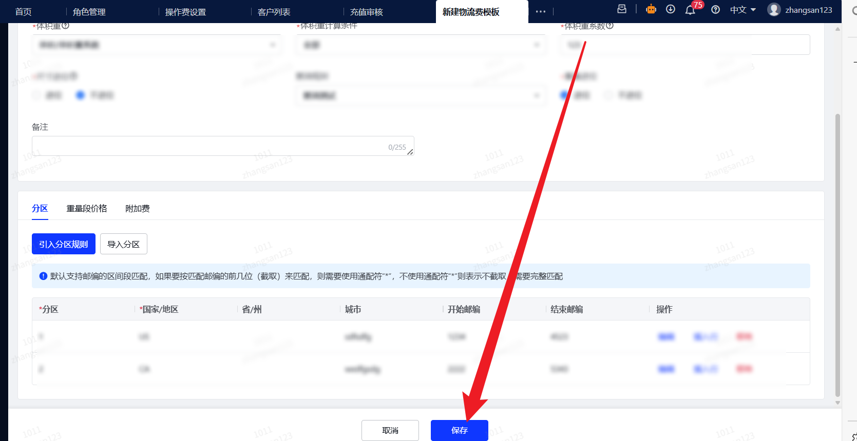 基础信息、分区、重量段价格、附加费设置完成后点击【保存】,即物流费模版创建完成。