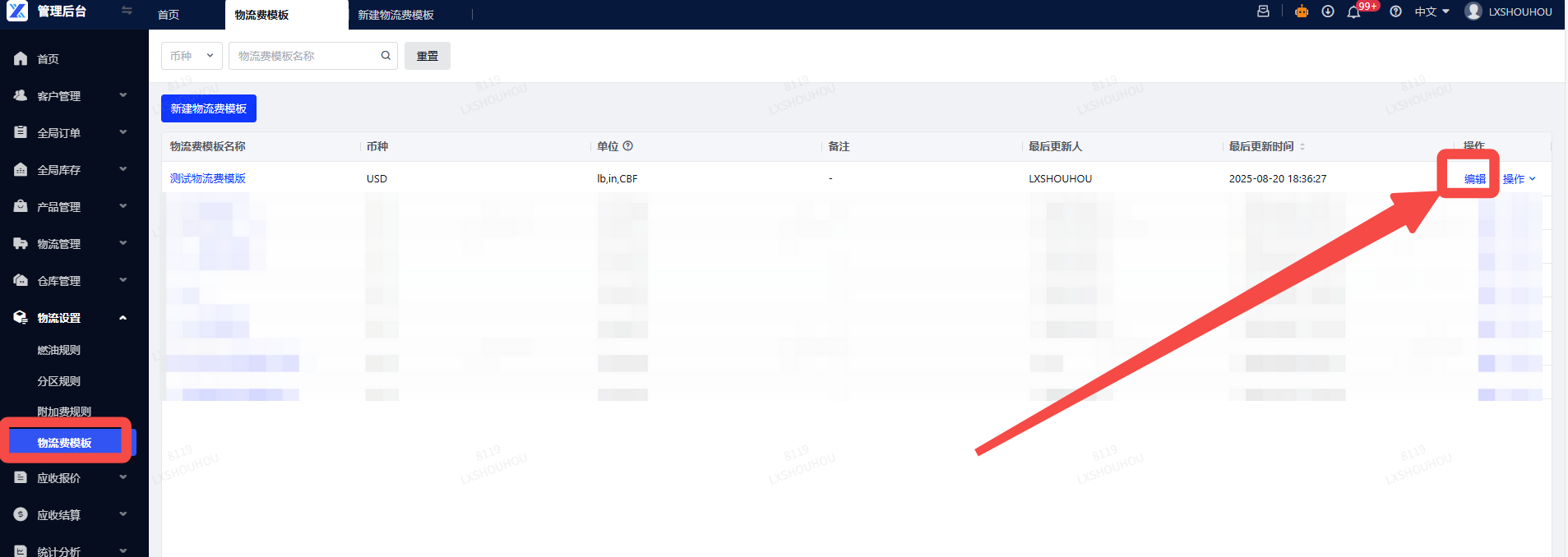 - 修改、更新物流费模版中的信息可以点击【编辑】,根据上述的操作指引进行修改,修改完成后点击保存