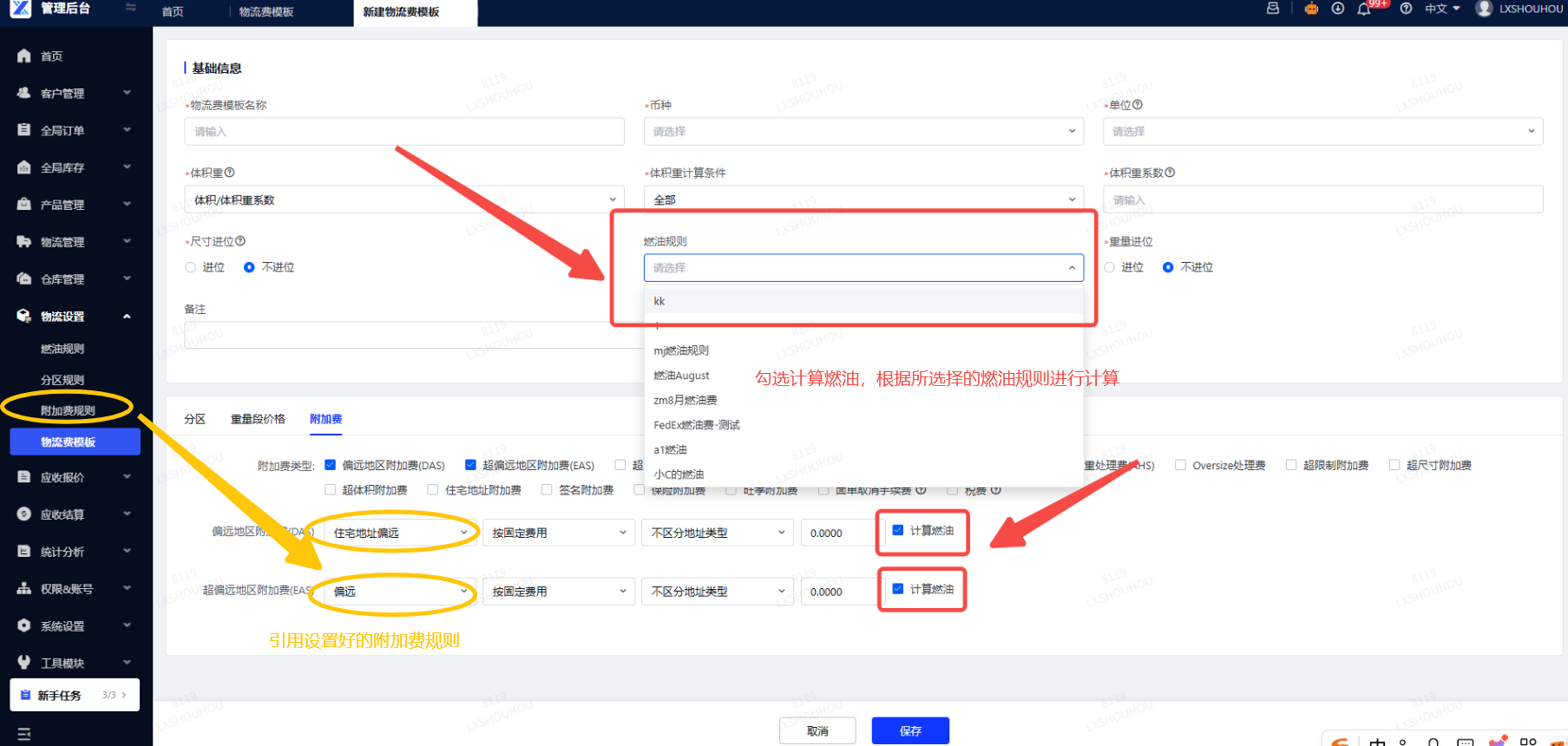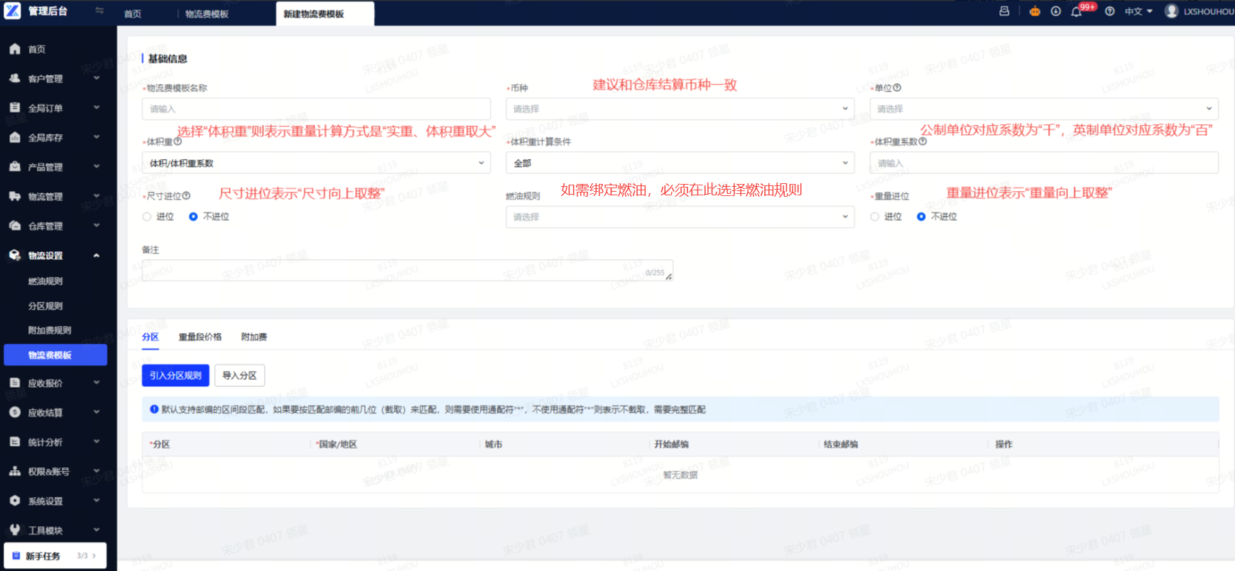 定义:通过组合物流费相关的规则:燃油规则、分区规则、附加费规则来创建一个基础的物流费用模版,