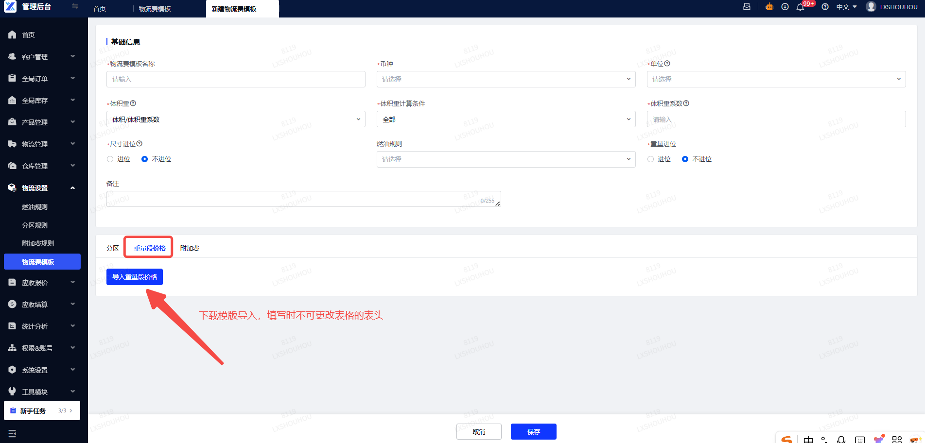 - 导入重量段价格:下载Excel表格导入重量段价格,表格的表头代表上一步设置好的分区,所以填写对应的重量段价格时不可更改表头。如果更改,会出现报错“重量段价格分区和分区规则不一致”