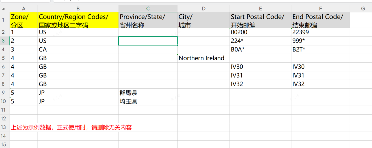 ● 分区内的省州、城市、邮编都不是必填项,可以只选其中的一项或者两项写。