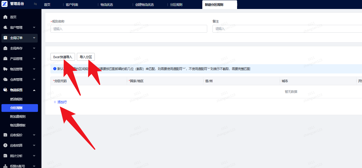 ● 导入分区:下载导入模板表格后,在表格里填写分区信息,上次到系统内,这种方式支持导入的数据记录不超出2000条;