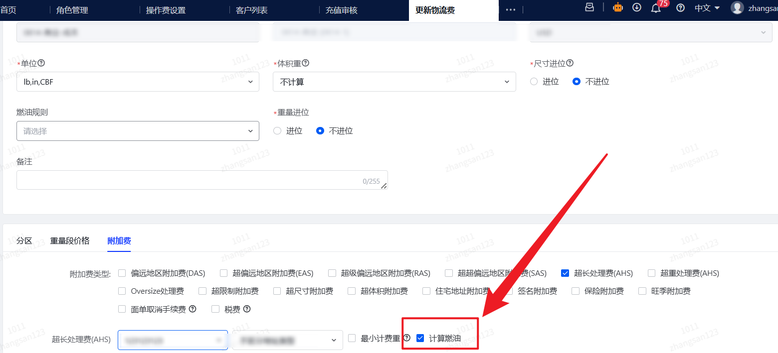 Q1:如何在设置物流费的时候,对附加费也收取燃油费?答案:设置物流费附加费的时候,勾选计算燃油即可,燃油费金额=(基础运费+勾选了计算燃油的附加费)*燃油费率。