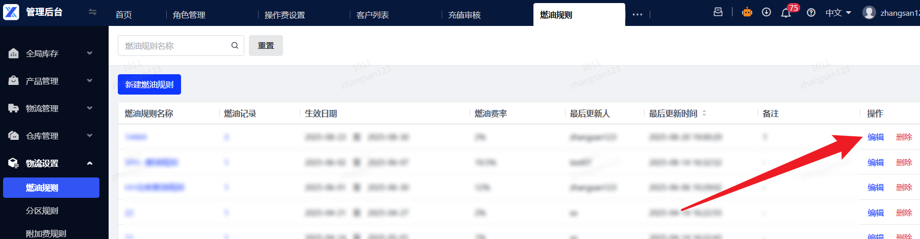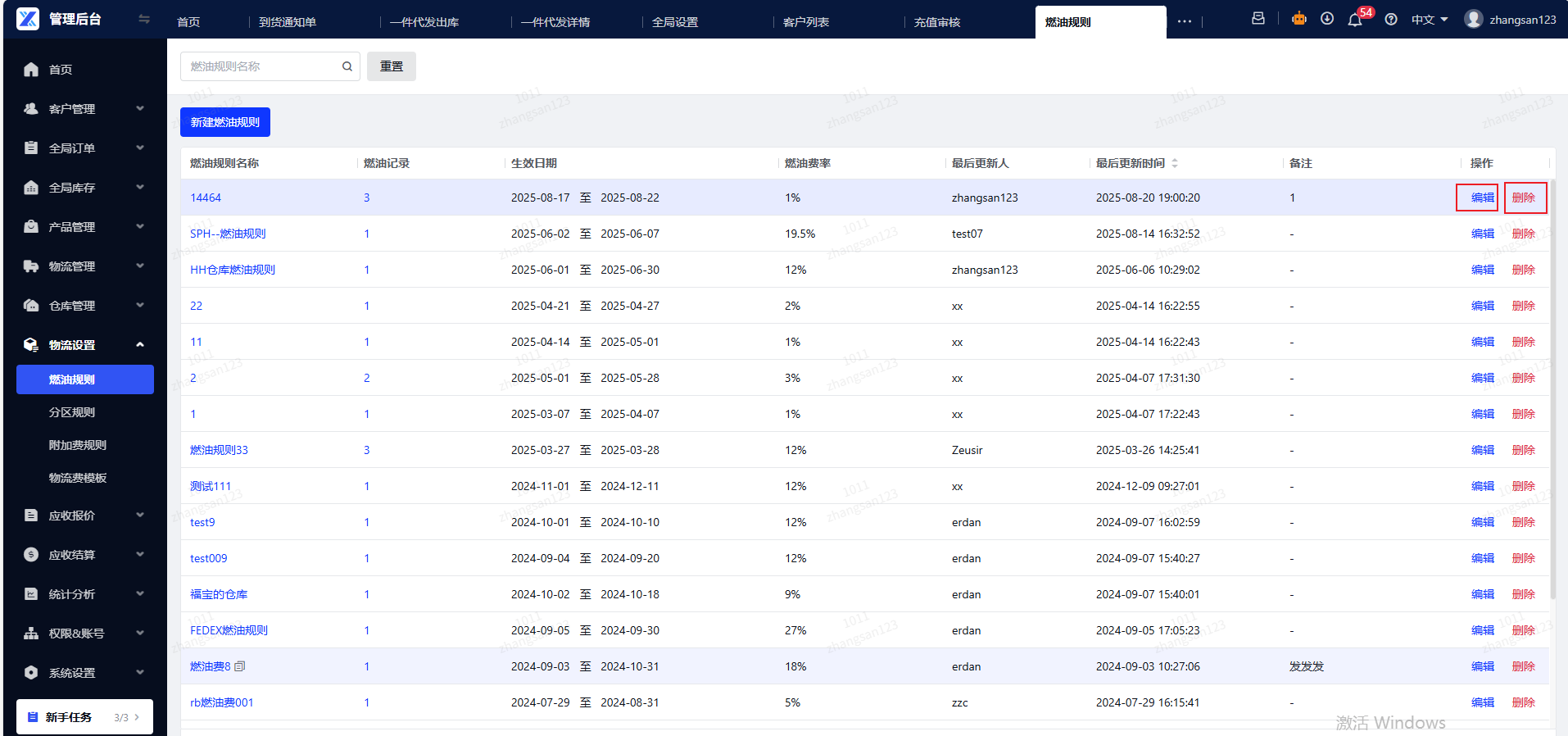 (4)编辑和删除:创建好燃油规则后,可点击编辑进行修改和更新,可点击删除进行删除。