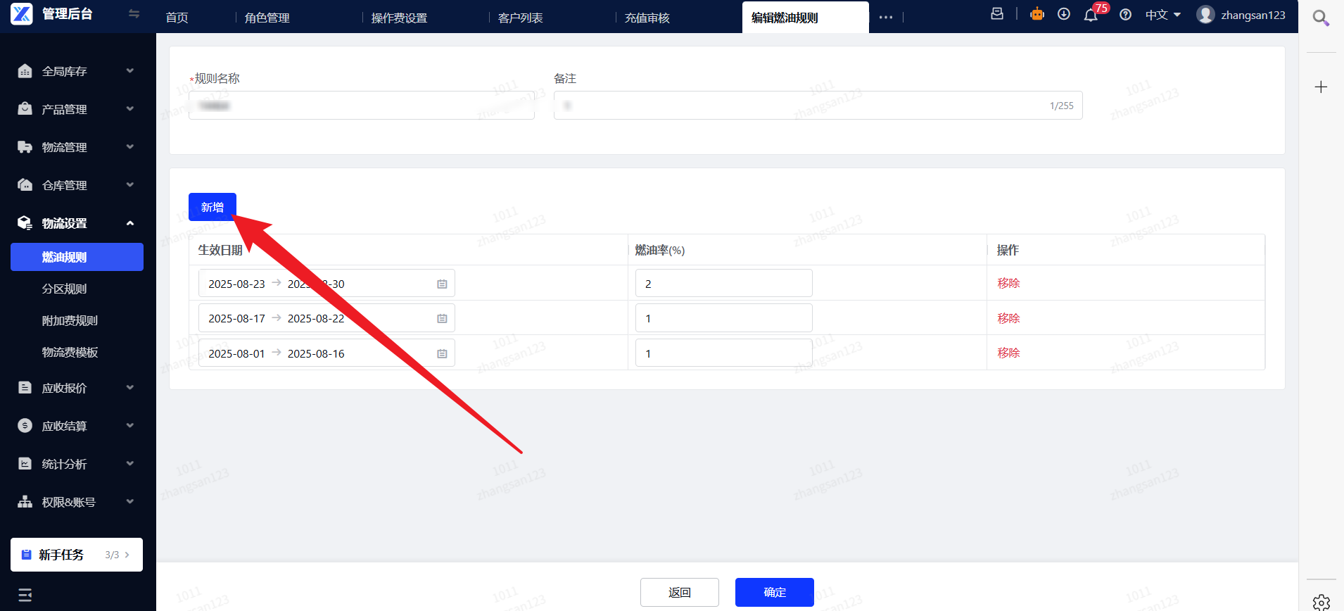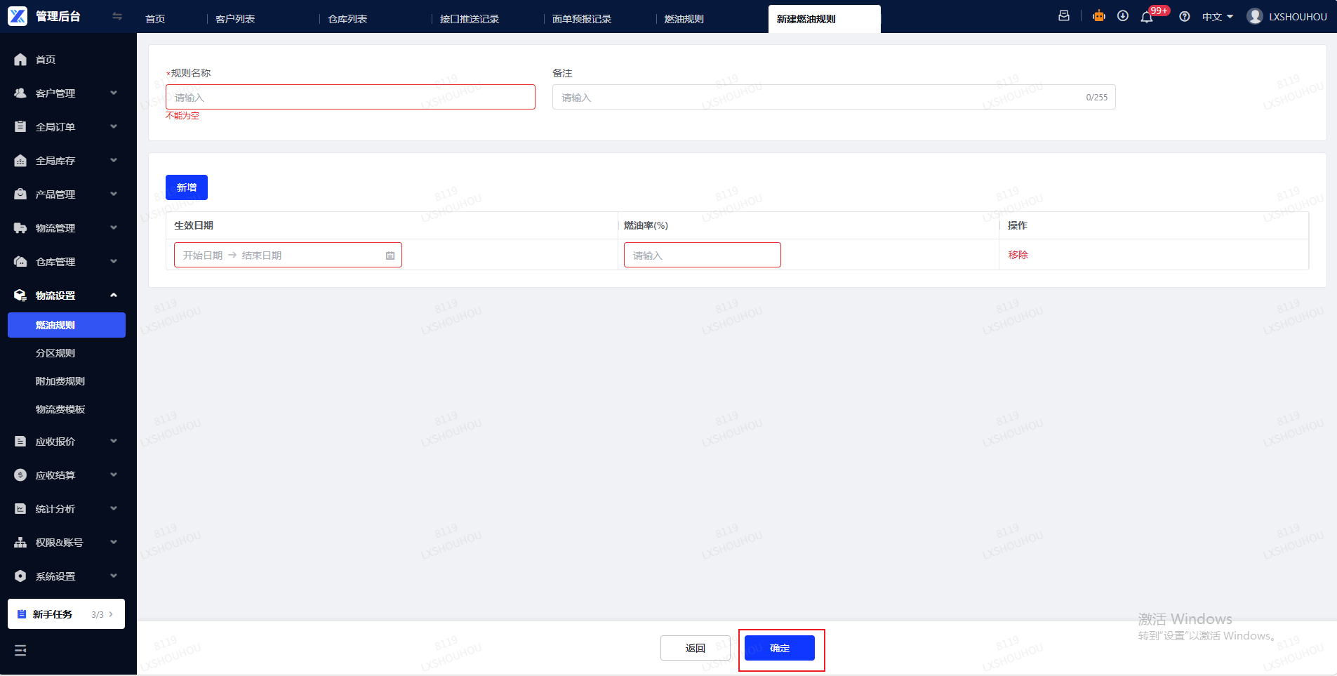 (3)填写基础信息:填写规则名称(自定义)、生效日期、燃油率等关键信息后点击确定保存。