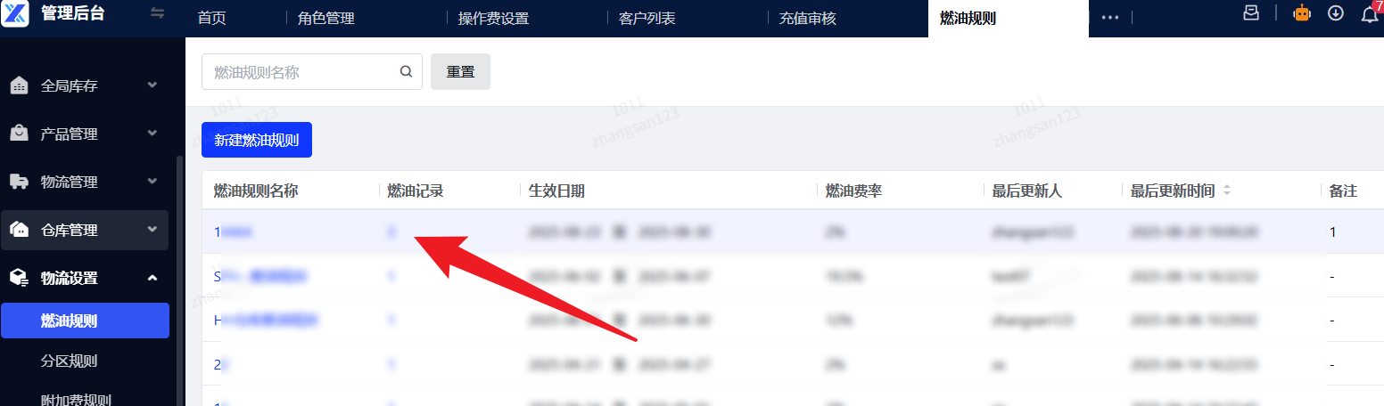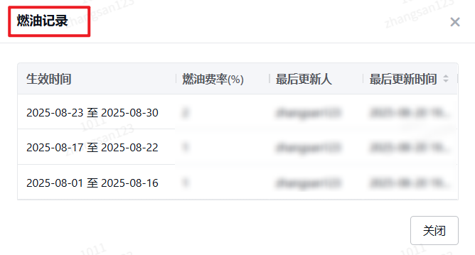 - 燃油记录:按不同的生效时间设置不同燃油费率的记录,燃油规则列表-燃油记录上显示的数字是燃油记录数量,点击数字之后,可以看到详细的记录