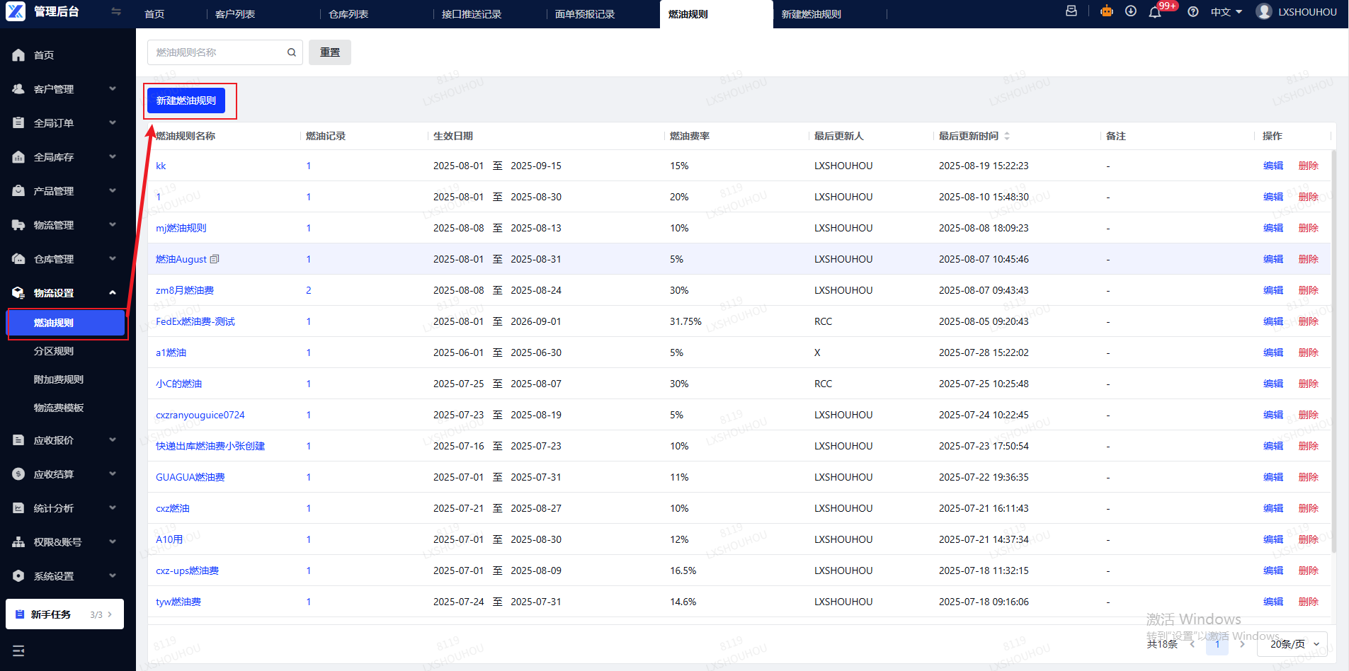 (2)创建燃油规则:导航至燃油规则菜单,点击新建燃油规则按钮。