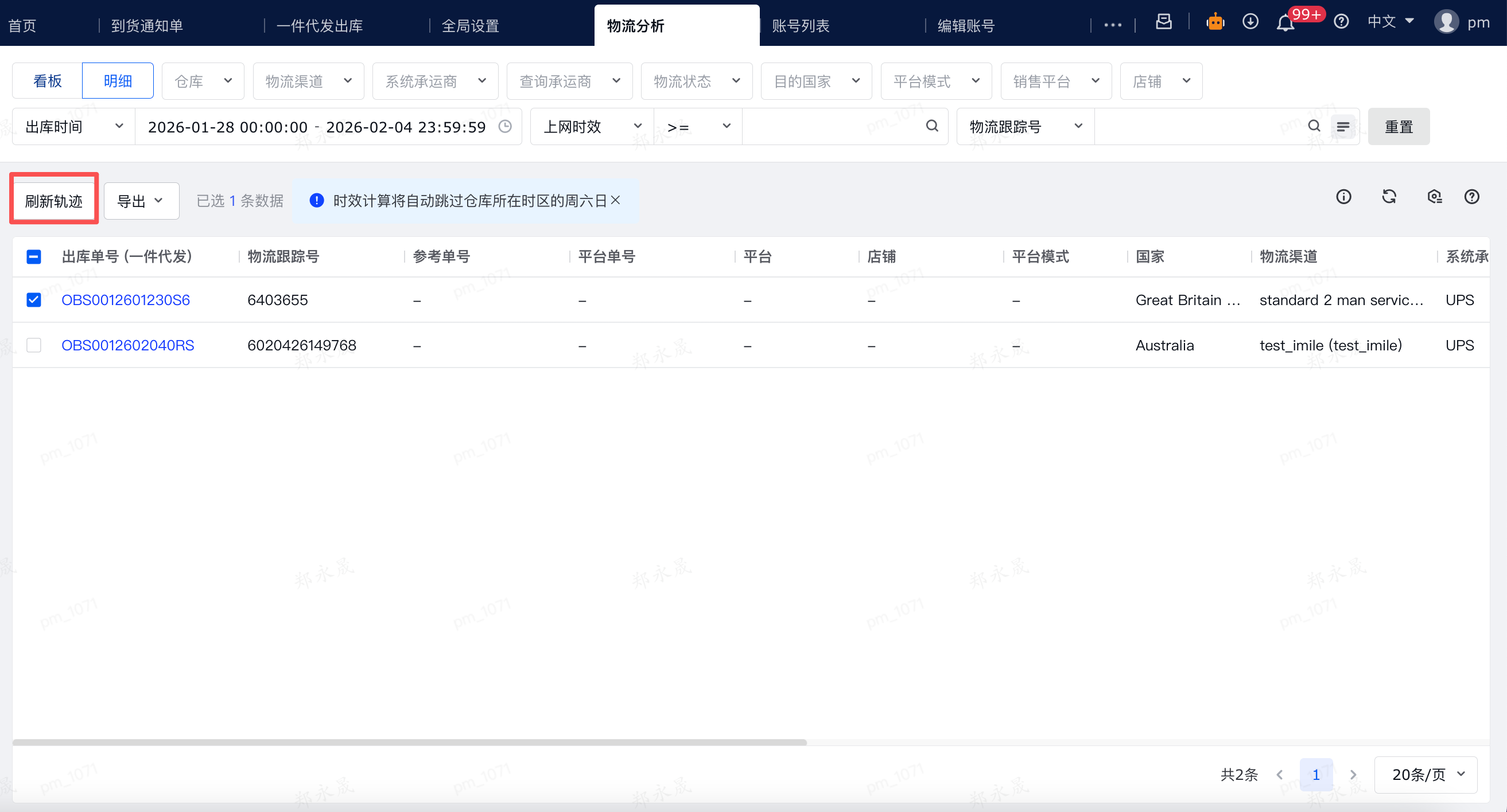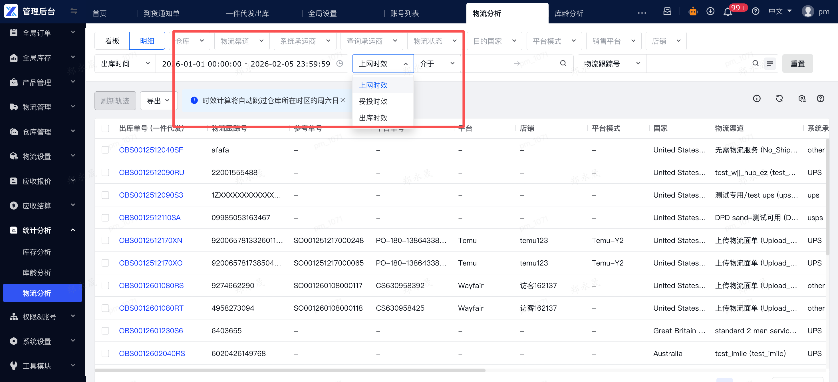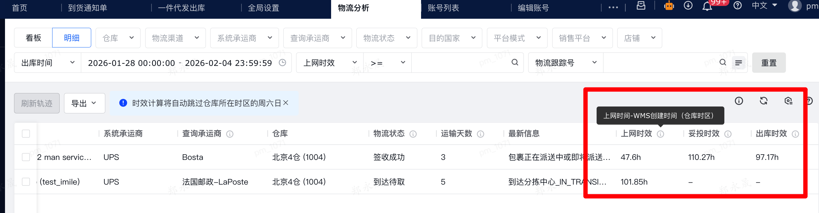 (3)查看数据:列表中的时间展示将统一转换为仓库本地时区,并自动计算每一单的出库、上网、妥投时效(跳过仓库所在时区的周六日)。