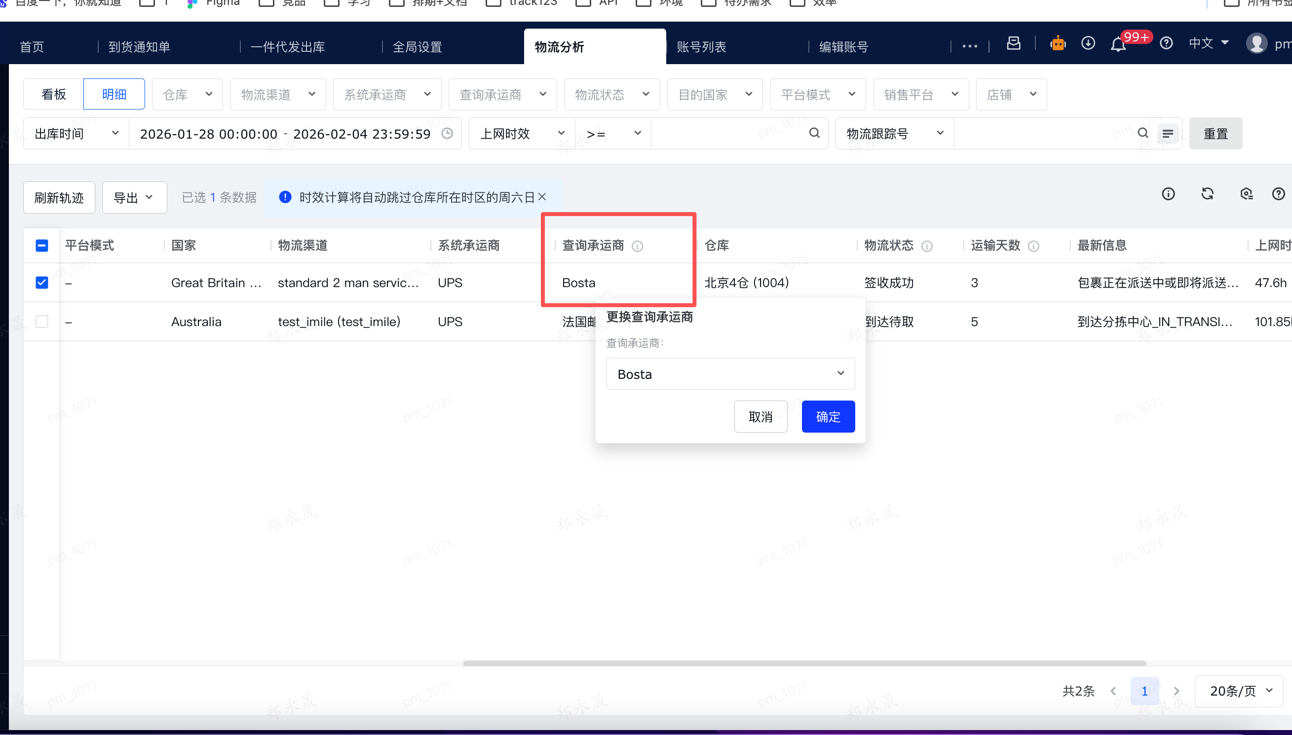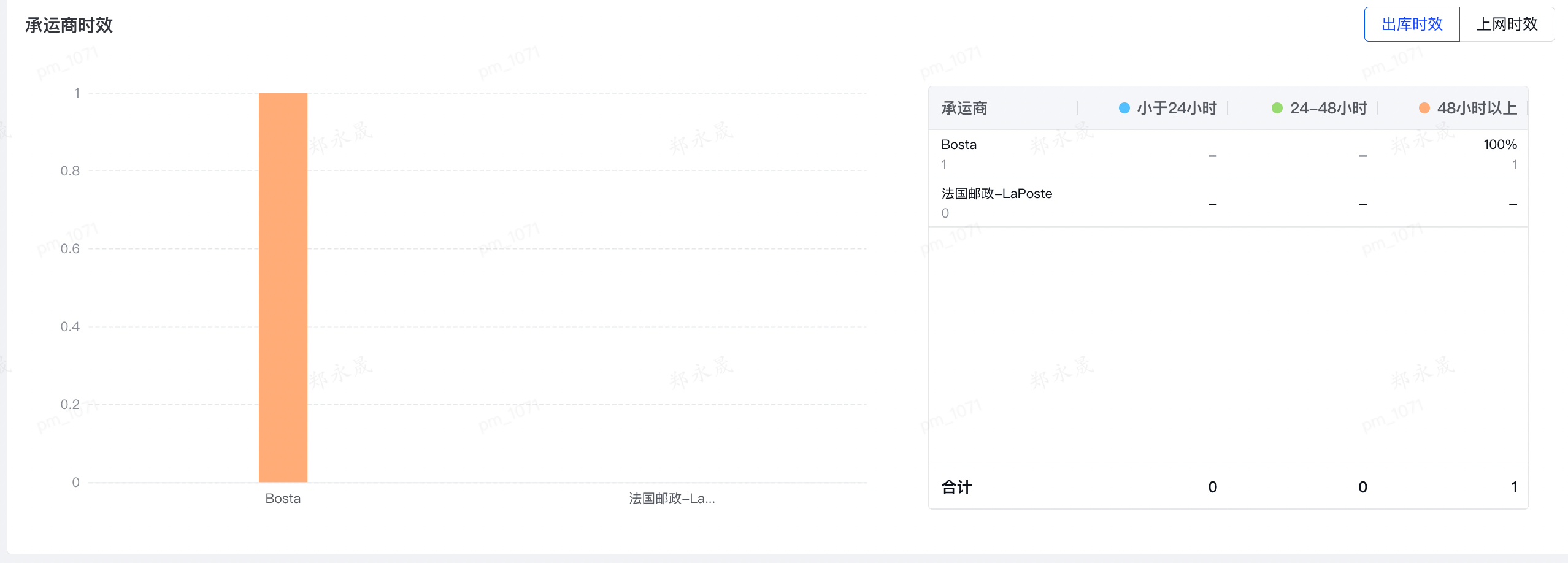 (3)承运商时效报表中,将按明细页的【查询承运商】来区分承运商