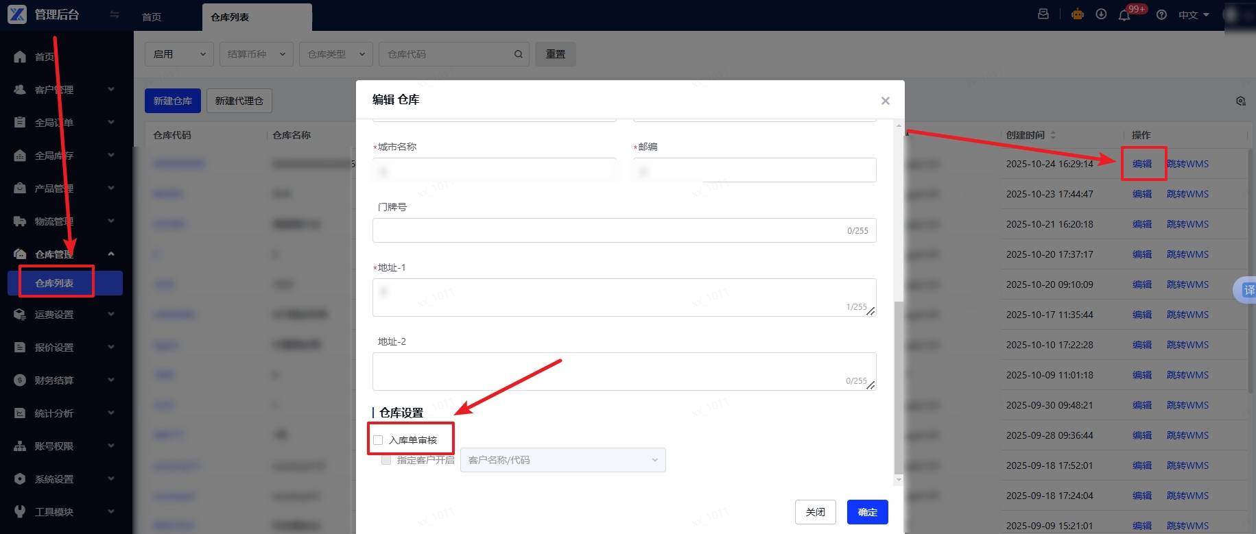 1、在OMP-仓库列表-新建&编辑页面中新增入库审核设置,默认不勾选,勾选后该仓库的入库单都需要审核;支持指定客户开启,即仅指定的客户在该仓库中需要入库审核。