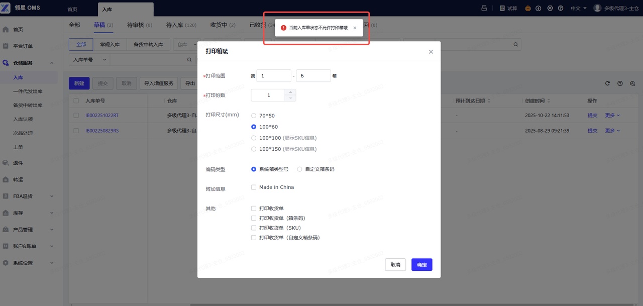2、OMS创建入库单时,若创建后保存至草稿,且单据内仓库开启了入库审核,则草稿状态下不支持打印箱唛。