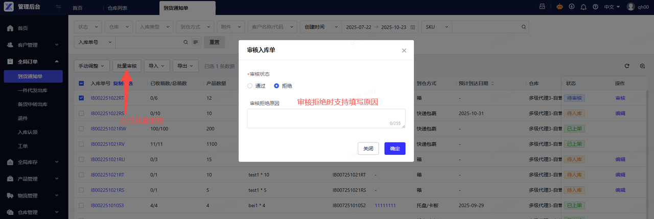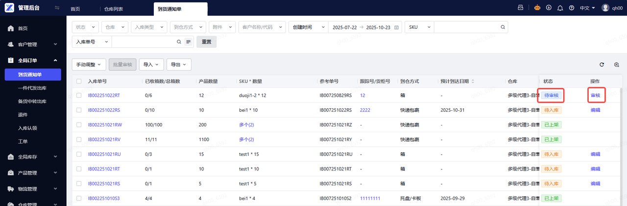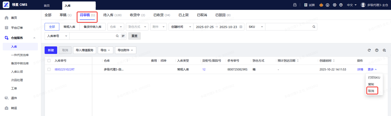 4、代理场景:若入库单为领星对领星的代理场景,则支持每套系统中分别设置是否需要审核,每套系统审核通过后才推到下级系统OMS,下级系统继续判断是否需要审核。