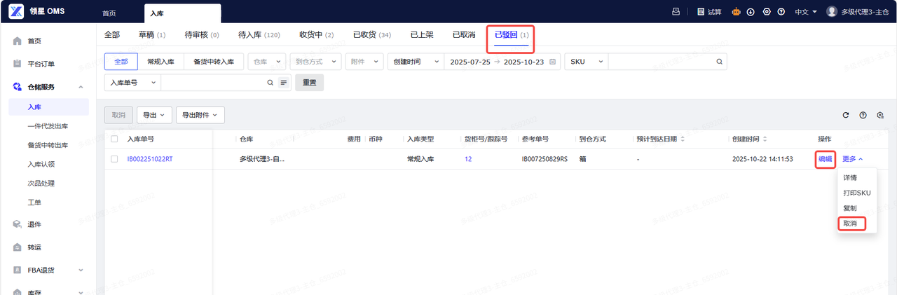 3.2、若OMP审核通过,则单据进入【待入库】状态,同时推至WMS(推送到WMS才支持打印箱唛);若订单审核拒绝,则单据进入【已驳回】状态,此时OMS支持在原单编辑重新提交,也可以取消订单。
