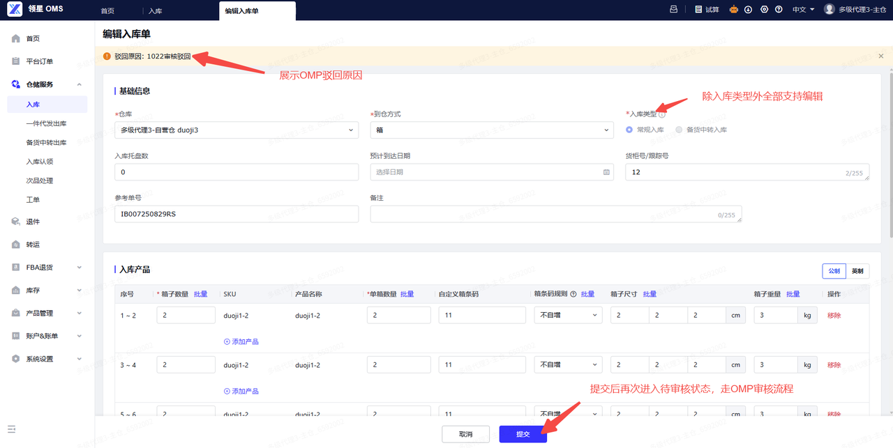 若下级系统审核驳回,则单据逐级驳回至最上游系统,此时仅最上游系统支持编辑重新提交单据;直至最下游仓库审核通过,推送链条上的每套系统均推送单据至WMS。