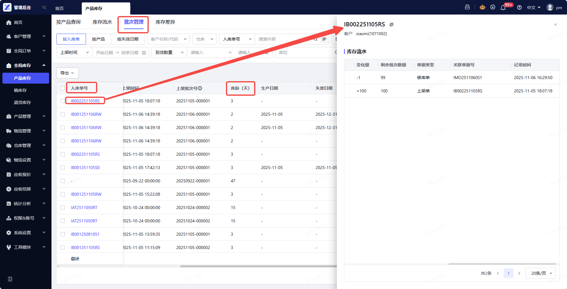 在此基础上用户可以查看库存对应的入库单、上架时间;查看出库、库内操作关联的入库单;库内移库、调整库存等操作可以指定到具体批次。