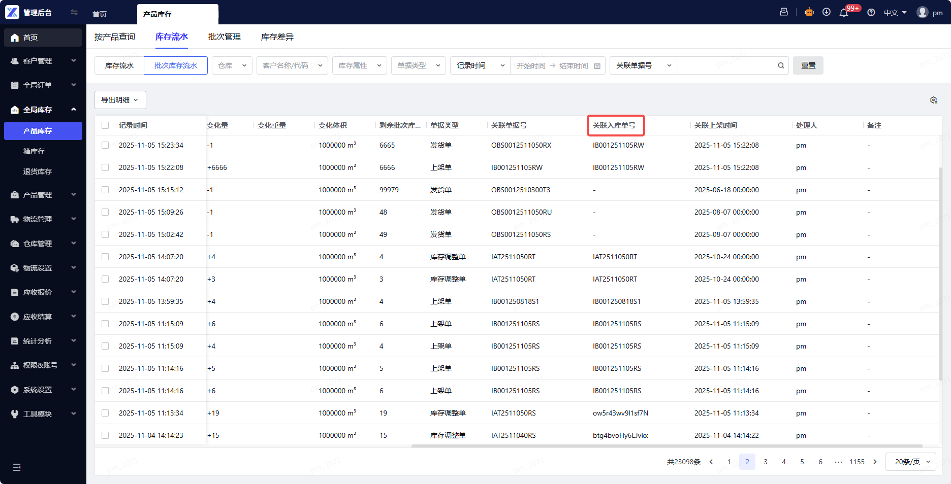 a、支持查看批次关联的入库单号,以及批次相关联的入库、库内操作、出库流水。