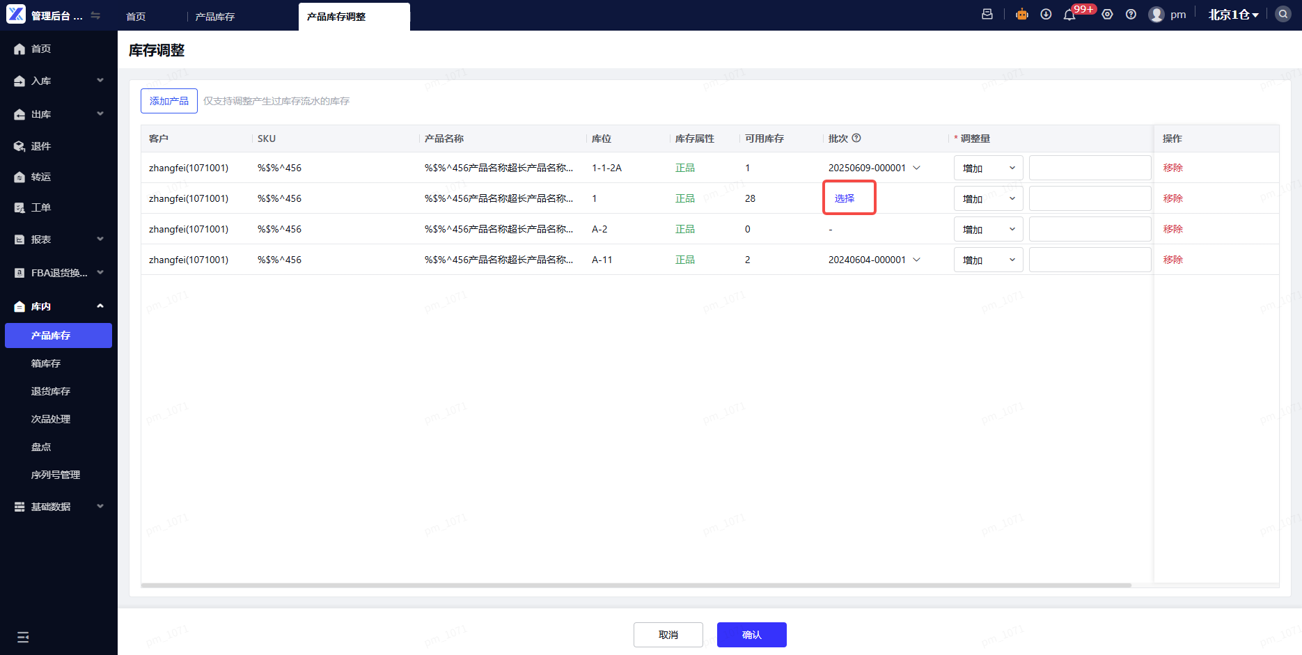 3、库存调整/移库指定批次:在进行库存调整、移库操作时,若库位上有多个批次,支持指定批次进行调整;若不指定批次,则按照系统默认逻辑先进先出进行调整。
