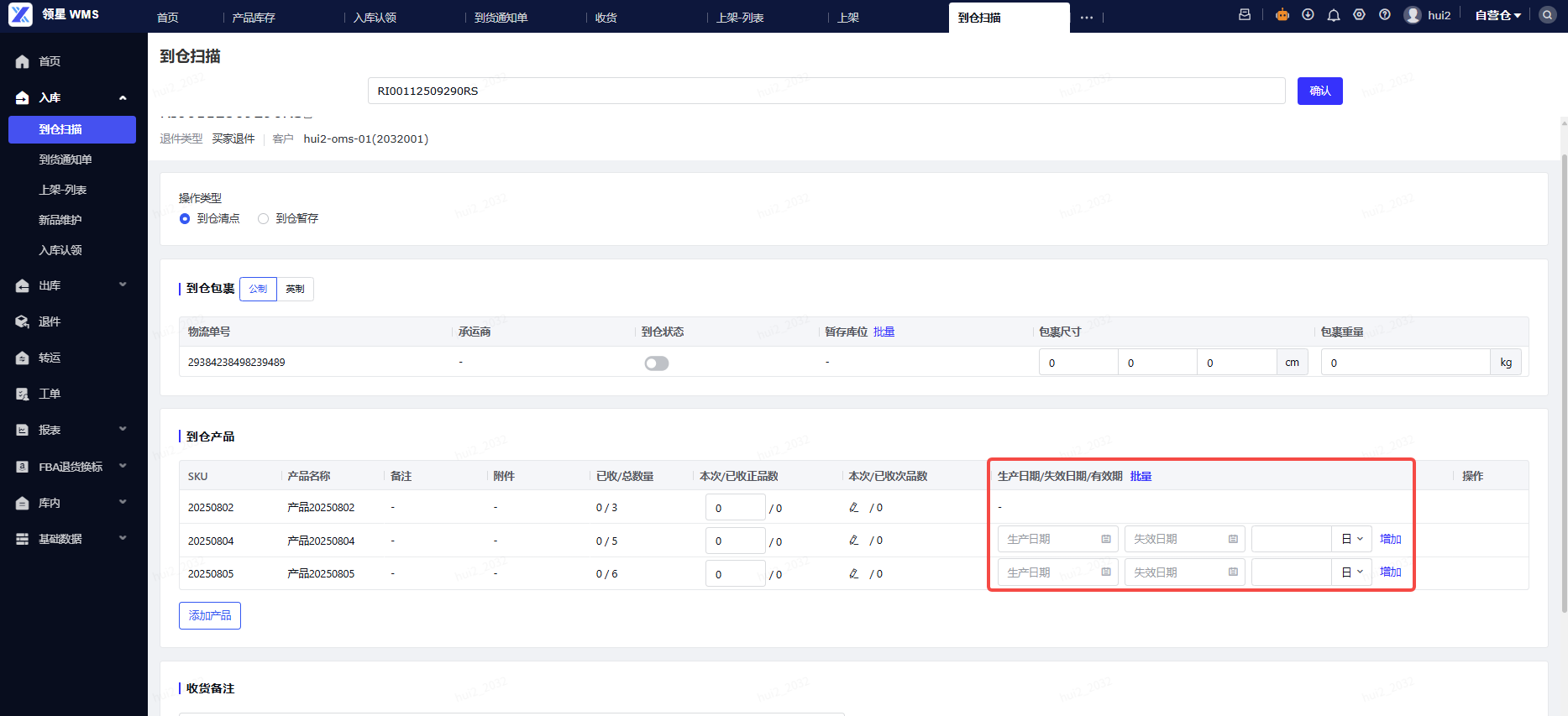 b、入库收货时,仓库需要为开启了效期管理的产品填写效期信息。(可以只填写失效日期;或者只填写生产日期+有效期)