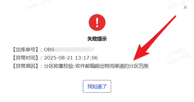 报错1:分区称重校验:收件邮编超出物流渠道的分区范围
