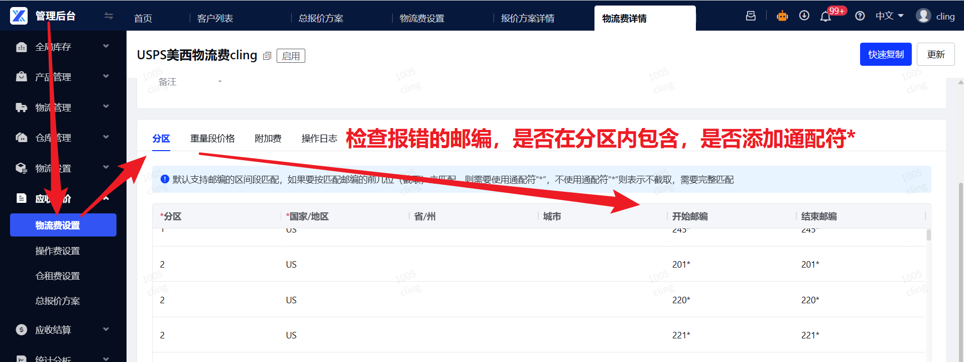 - 确认报错客户的报价方案、报错的物流渠道及邮编,点击报价方案,检查物流费的分区内邮编