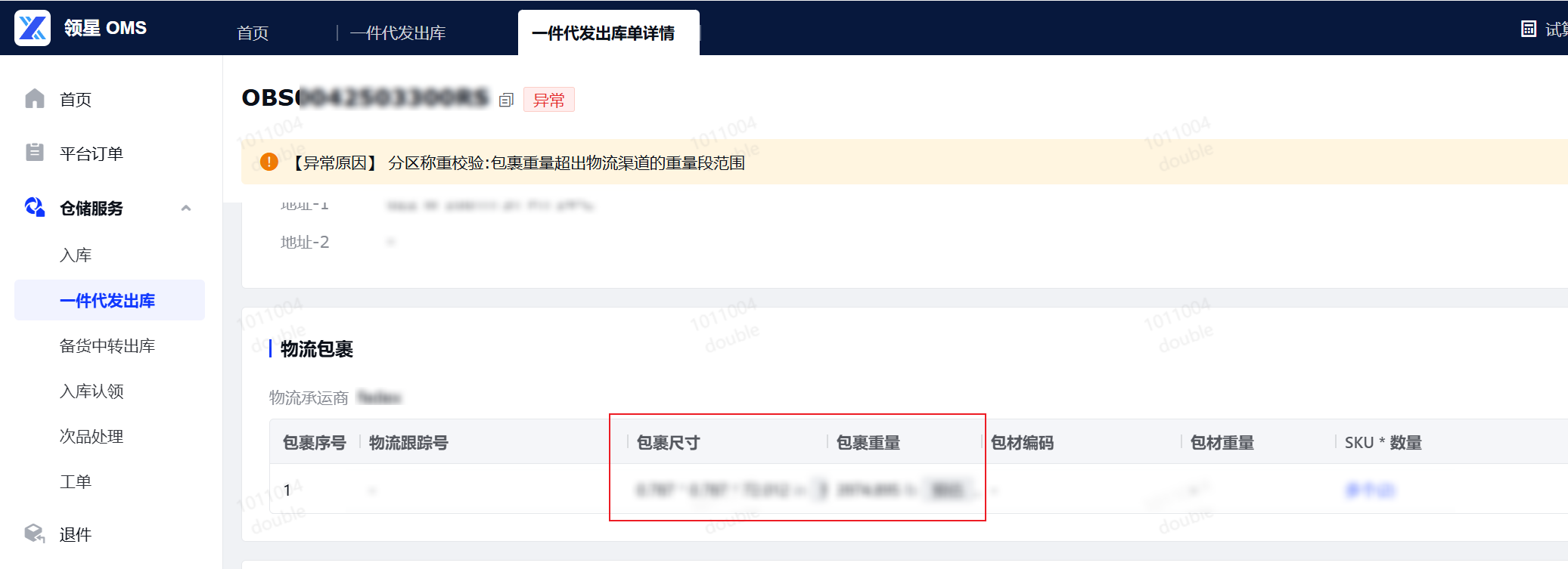 2、 若物流费设置是体积重实重取大值,需要先看包裹的尺寸跟重量数据,点进OMS的异常出库单内查看