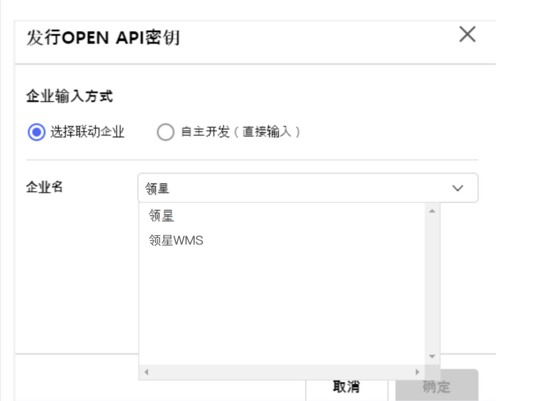 (4)如果还没有密钥,点击获取API key,在弹出框中选择OpenAPI,企业输入方式选择联动企业,搜索并选择“领星WMS”,生成后可复制密钥