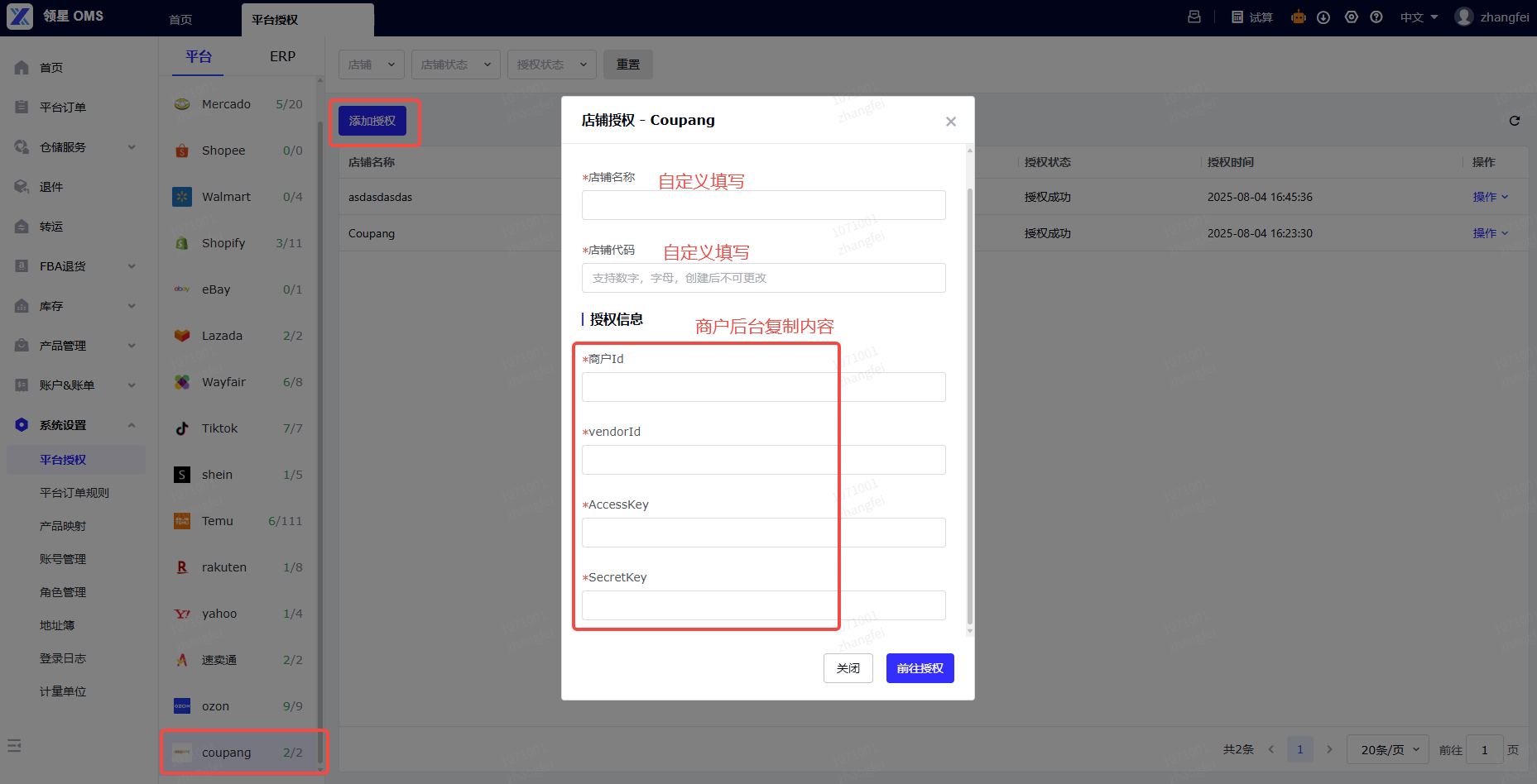 定义:通过OMS系统的平台授权将Coupang店铺与OMS进行连接绑定,使OMS能够获取Coupang店铺相关订单数据和权限,从而实现对店铺订单等业务的统一管理。