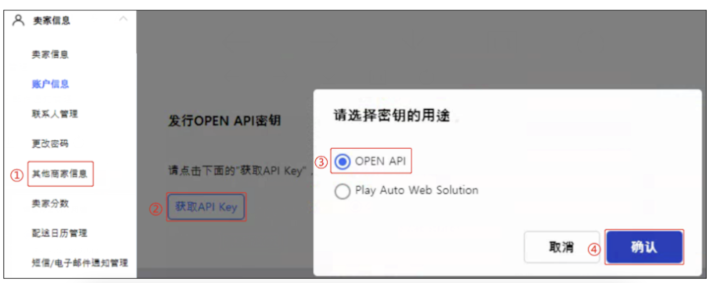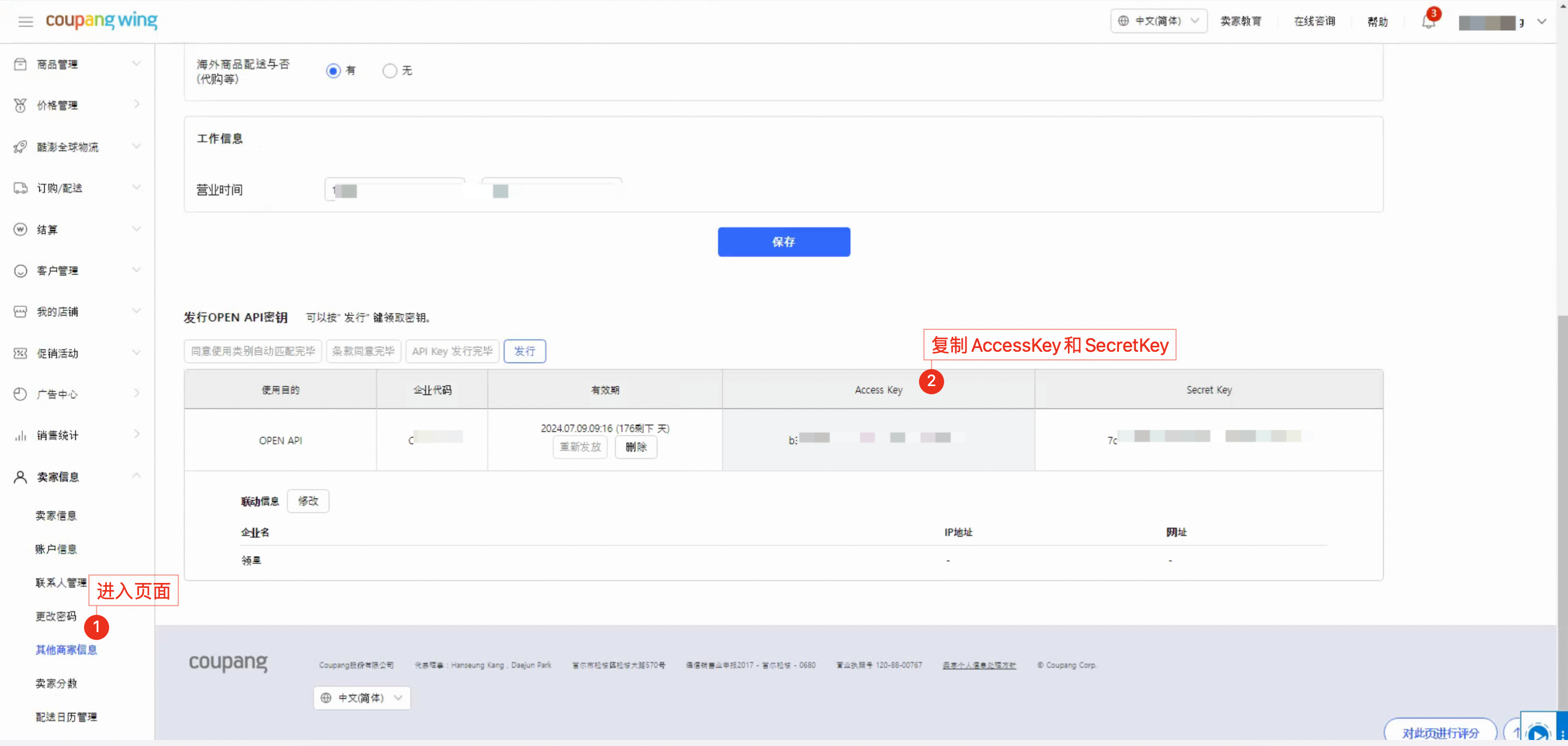 (3)进入【其他商家信息】,登录账号后可见OPEN API 密钥,复制AccessKey和SecretKey