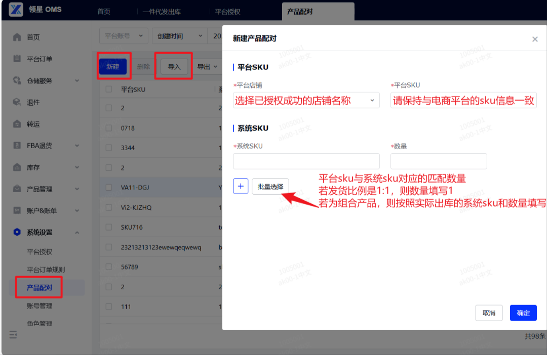 操作步骤:OMS系统设置 > 产品配对 > 新建/导入