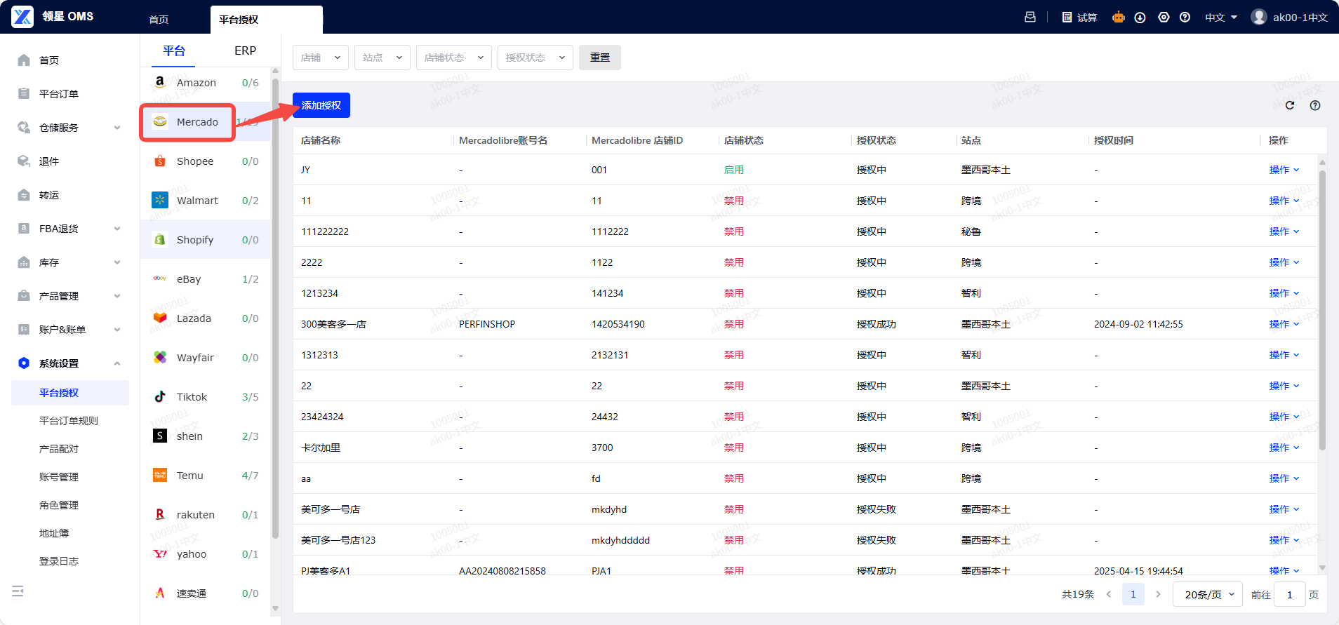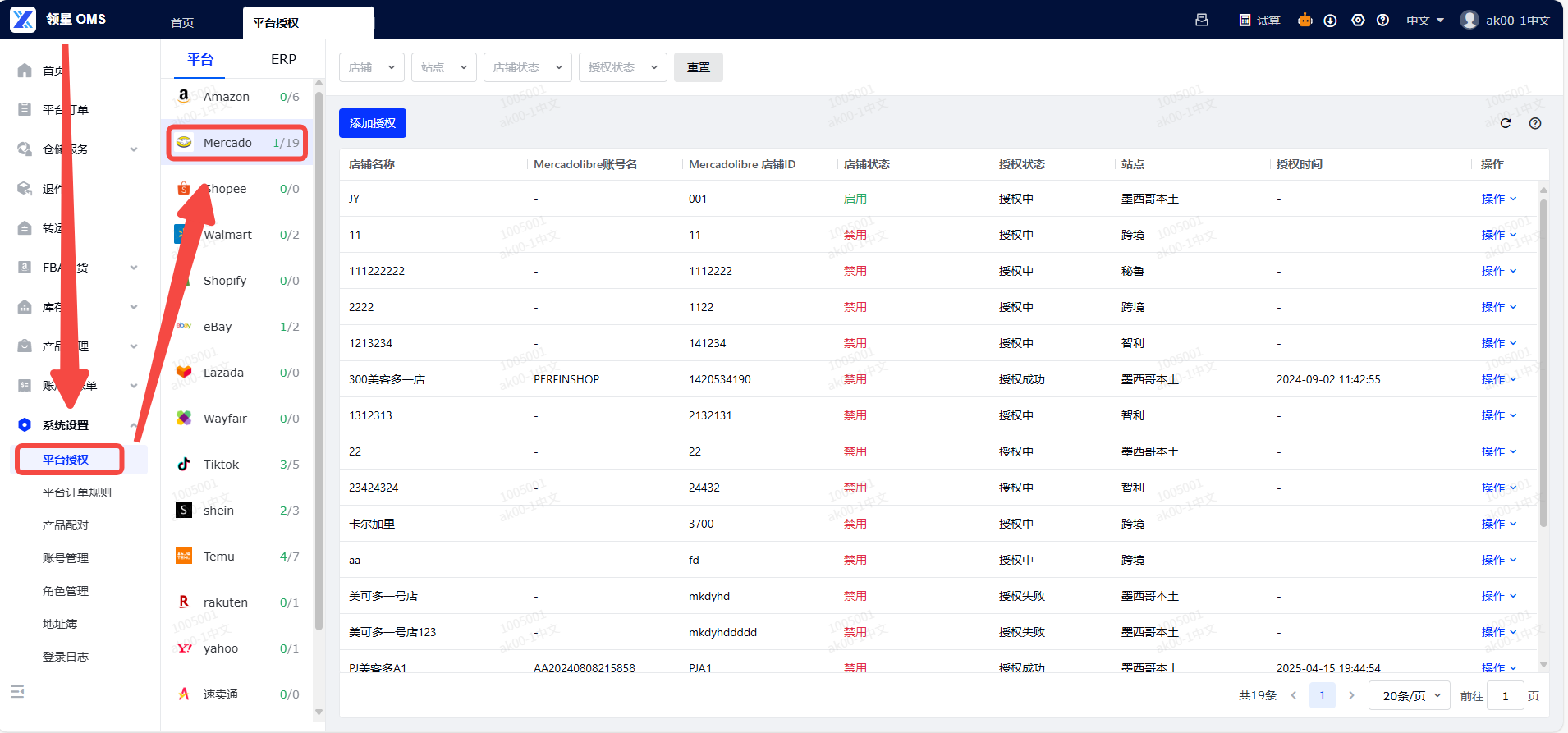 登录您的OMS管理后台,导航至【系统设置-平台授权-Mercado】位置。