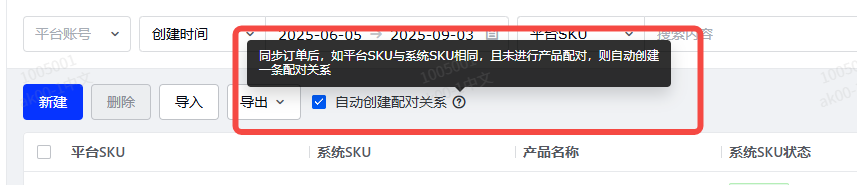 ● 自动创建配对关系:平台SKU与系统SKU一致,且未进行产品配对时,订单同步后可自动创建一条平台SKU:系统SKU=1:1的配对关系。